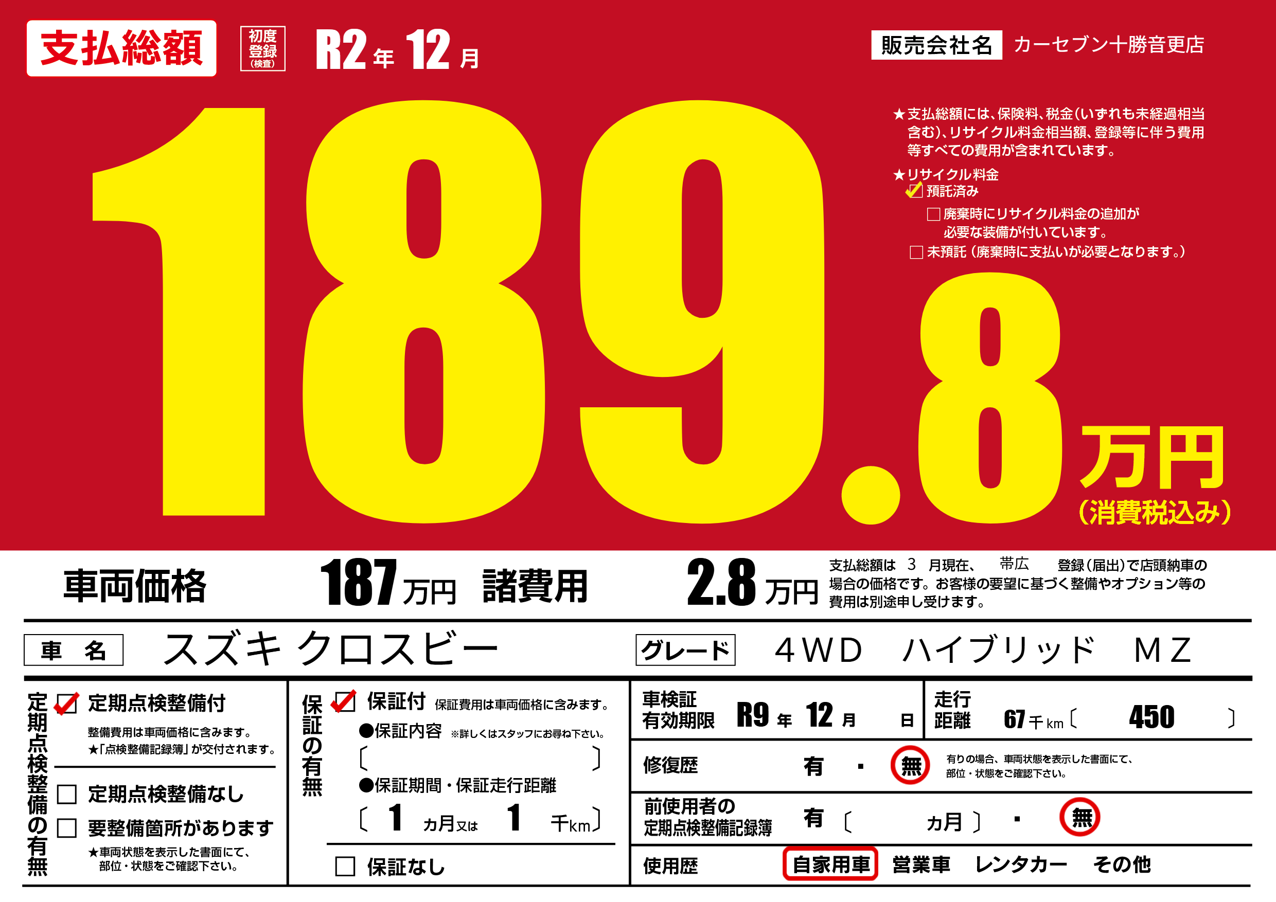 なし | 車検制限 | R9年12月---月 |