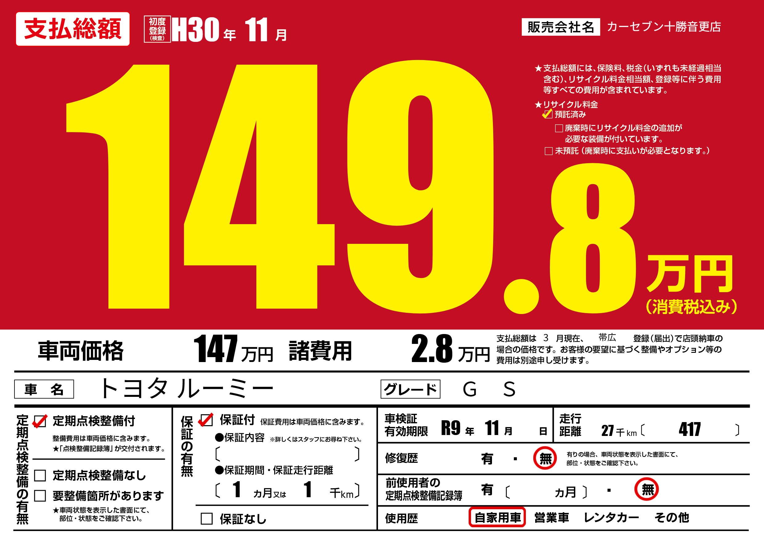 | 車検制限 | R9年 11月 - 日 | ||