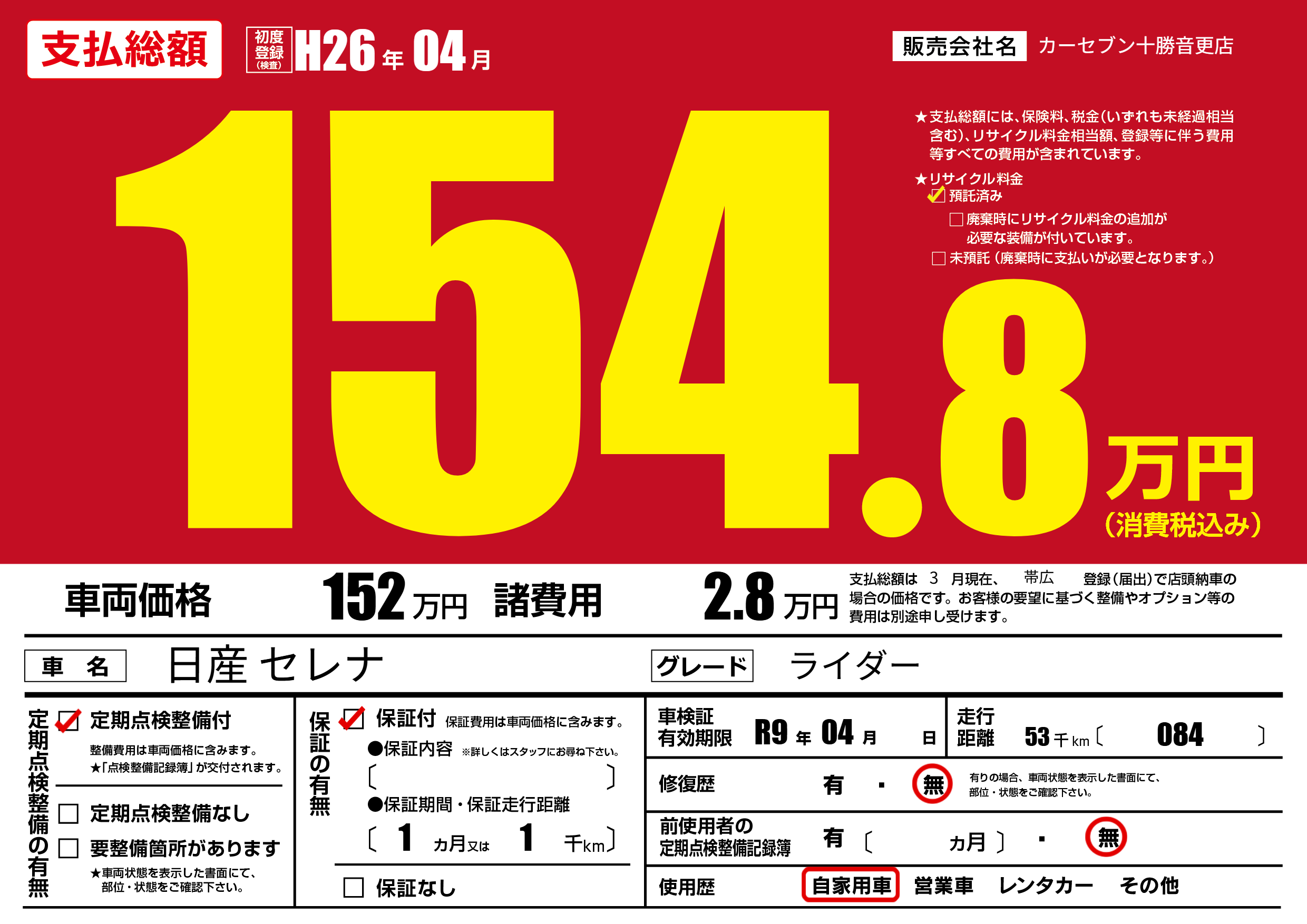 | 車名 | 日産 セレナ | グレード ミッション 排気量 |