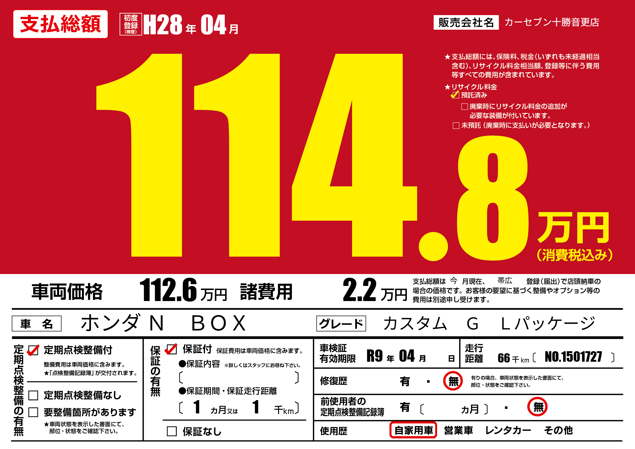 | 走行キロ | 6.6万km | 初年度登録 | H28年04月 |