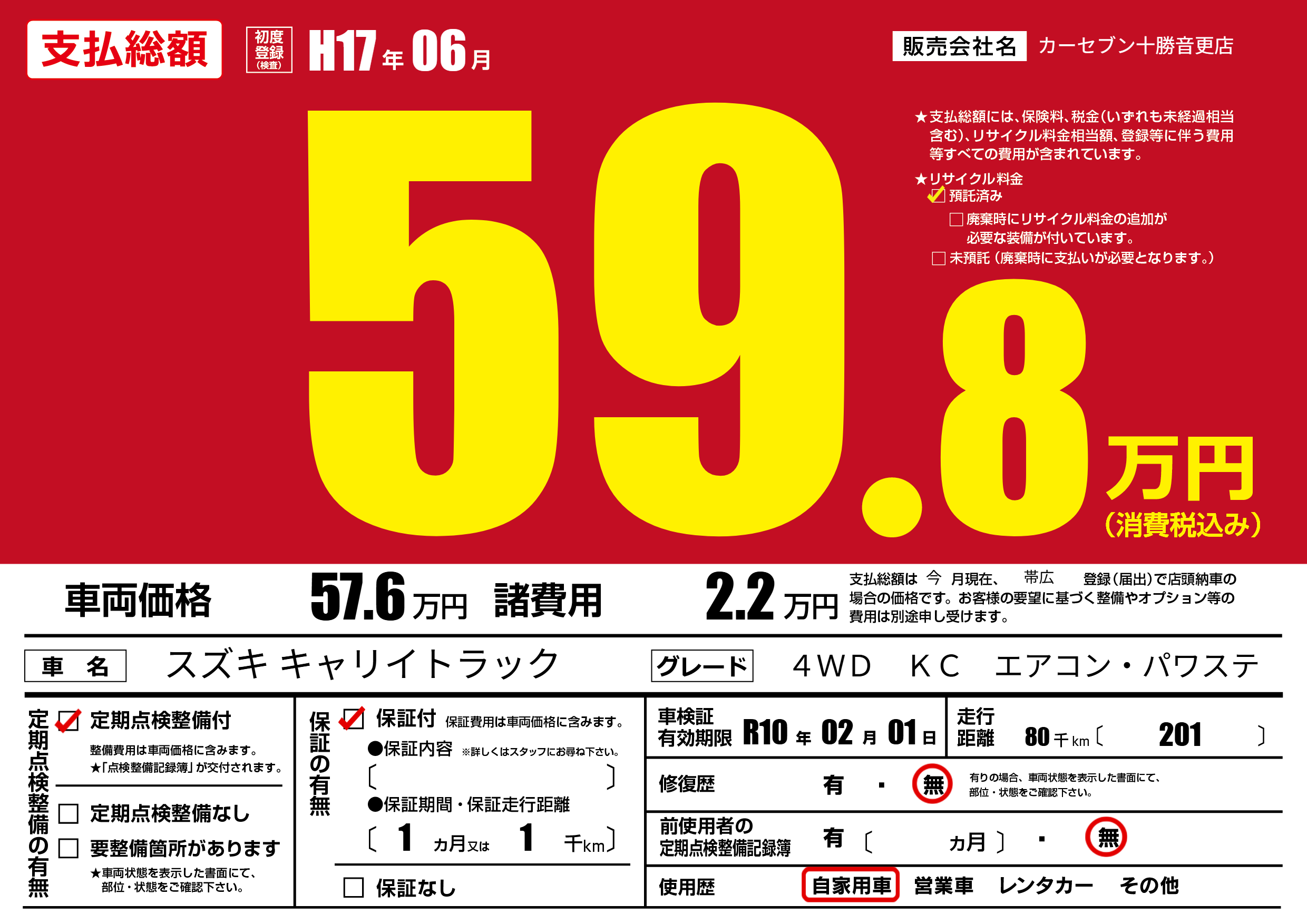 | 走行キロ | 8万km | 初年度登録 | H17年06月 |
