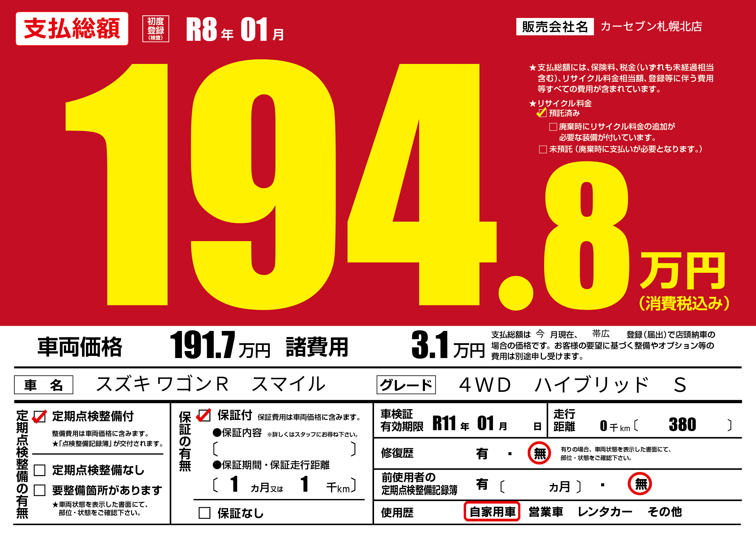 | 車検制限 | R11年 01月 - 日 | ||