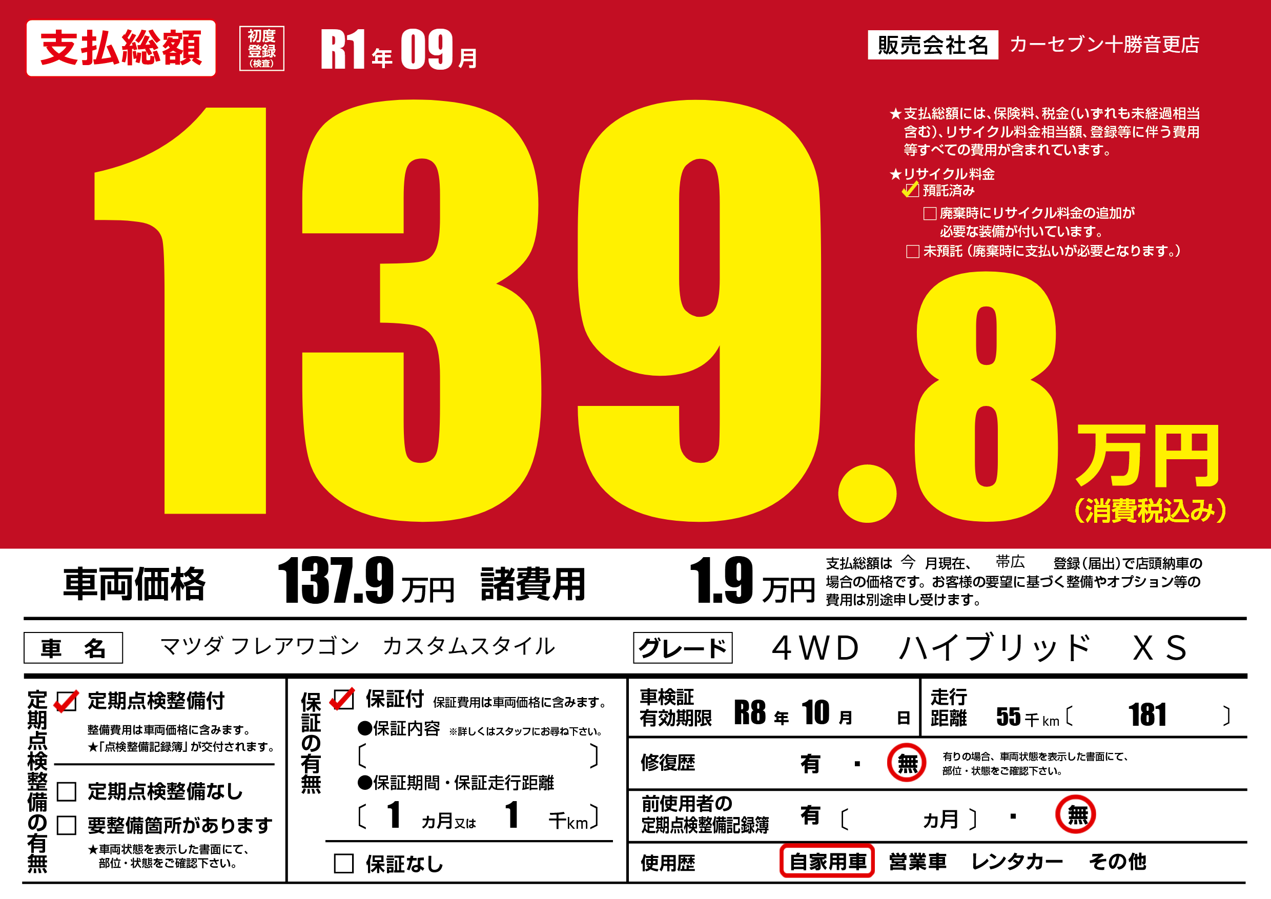 | 車検制限 | R8年 10月 - 日 | ||
