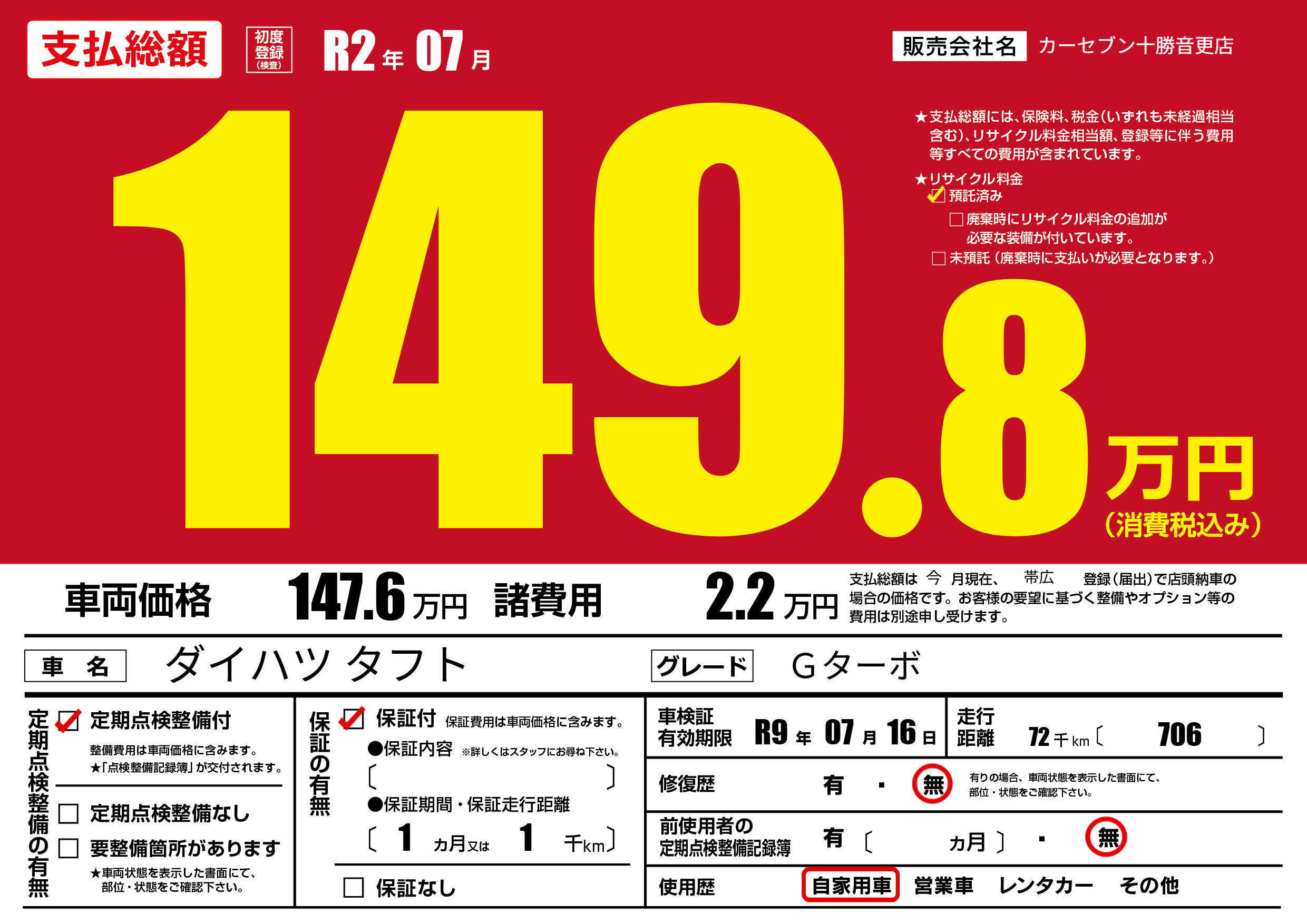 | 走行キロ | 7.2万km | 初年度登録 | R2年07月 |