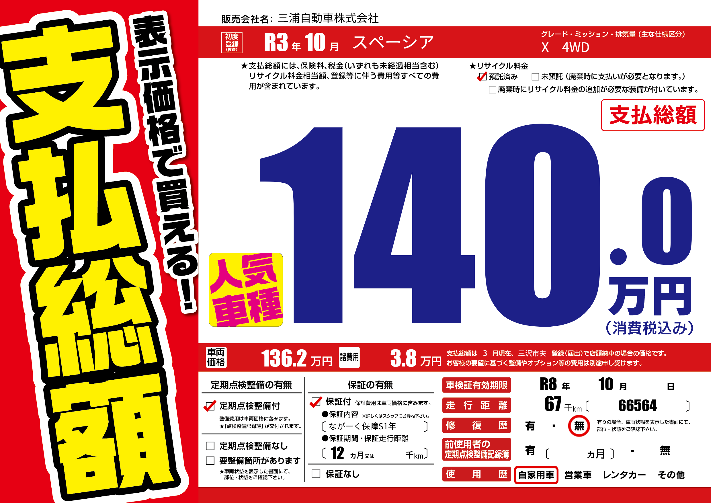 | 車名 | スペーシア | グレード ミッション 排気量 |