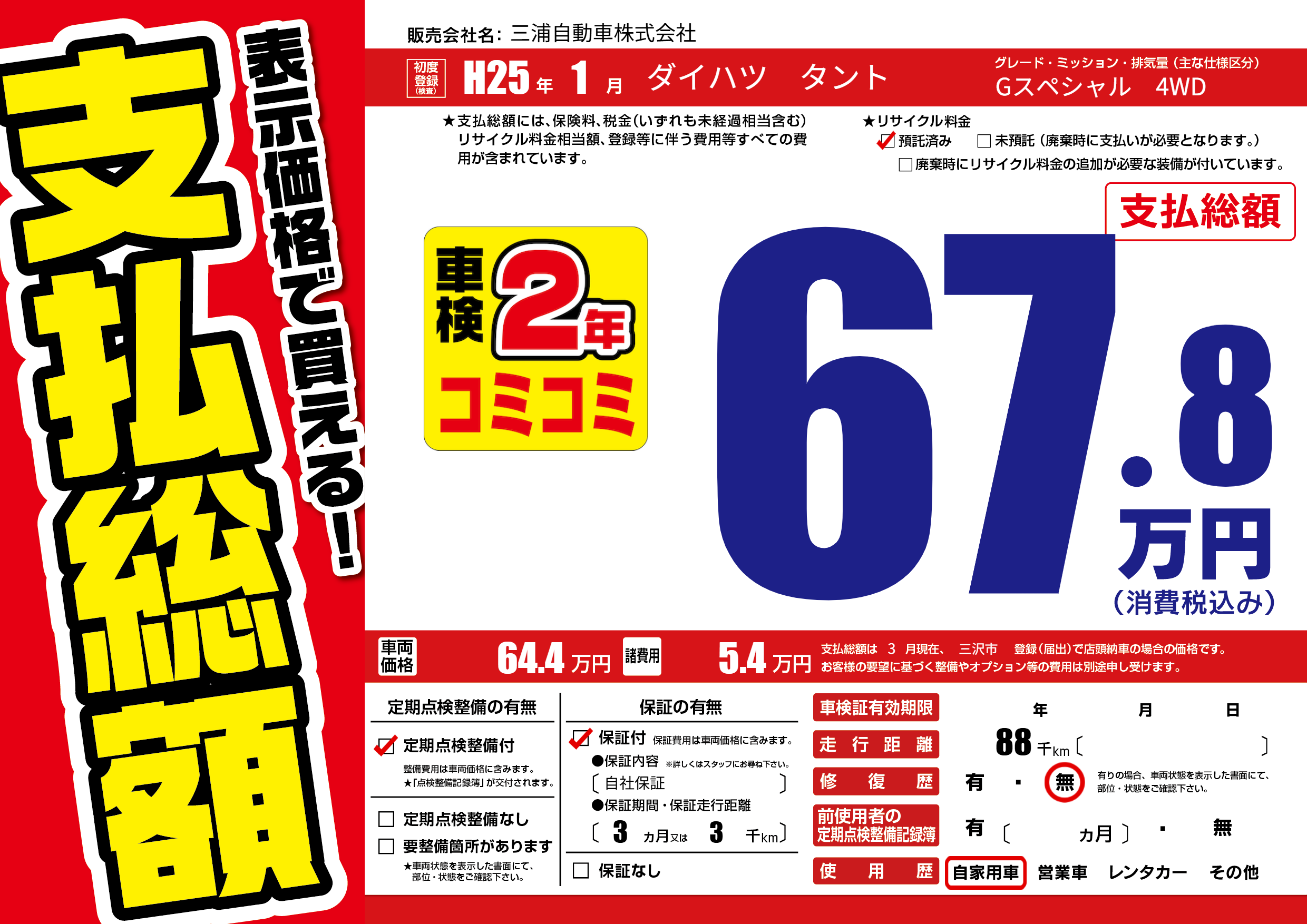保証付き 保証内容(自社保証) 3ヶ月または(3)千kmまで |