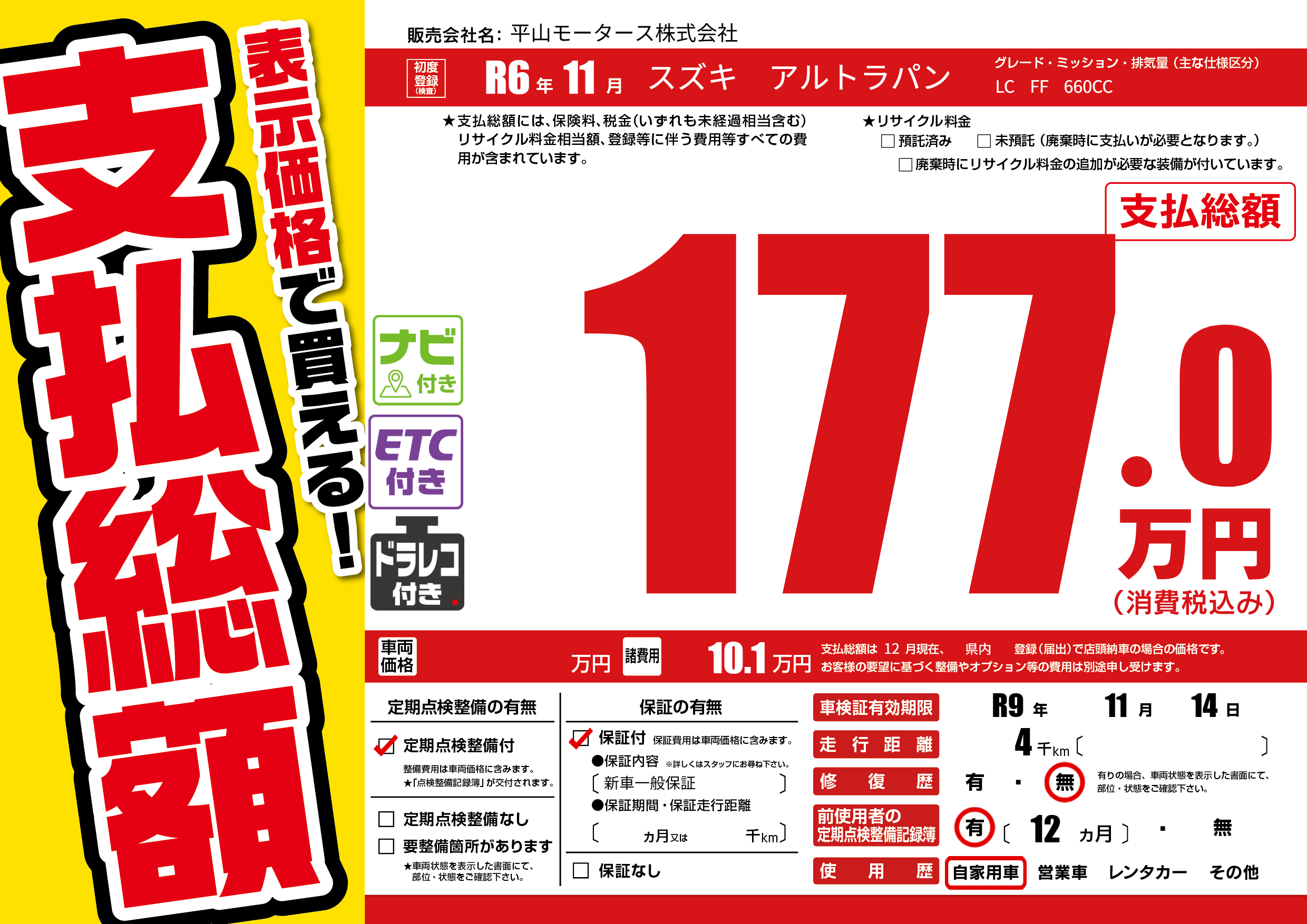 | 走行キロ | 0.4万km | 初年度登録 | R6年11月 |