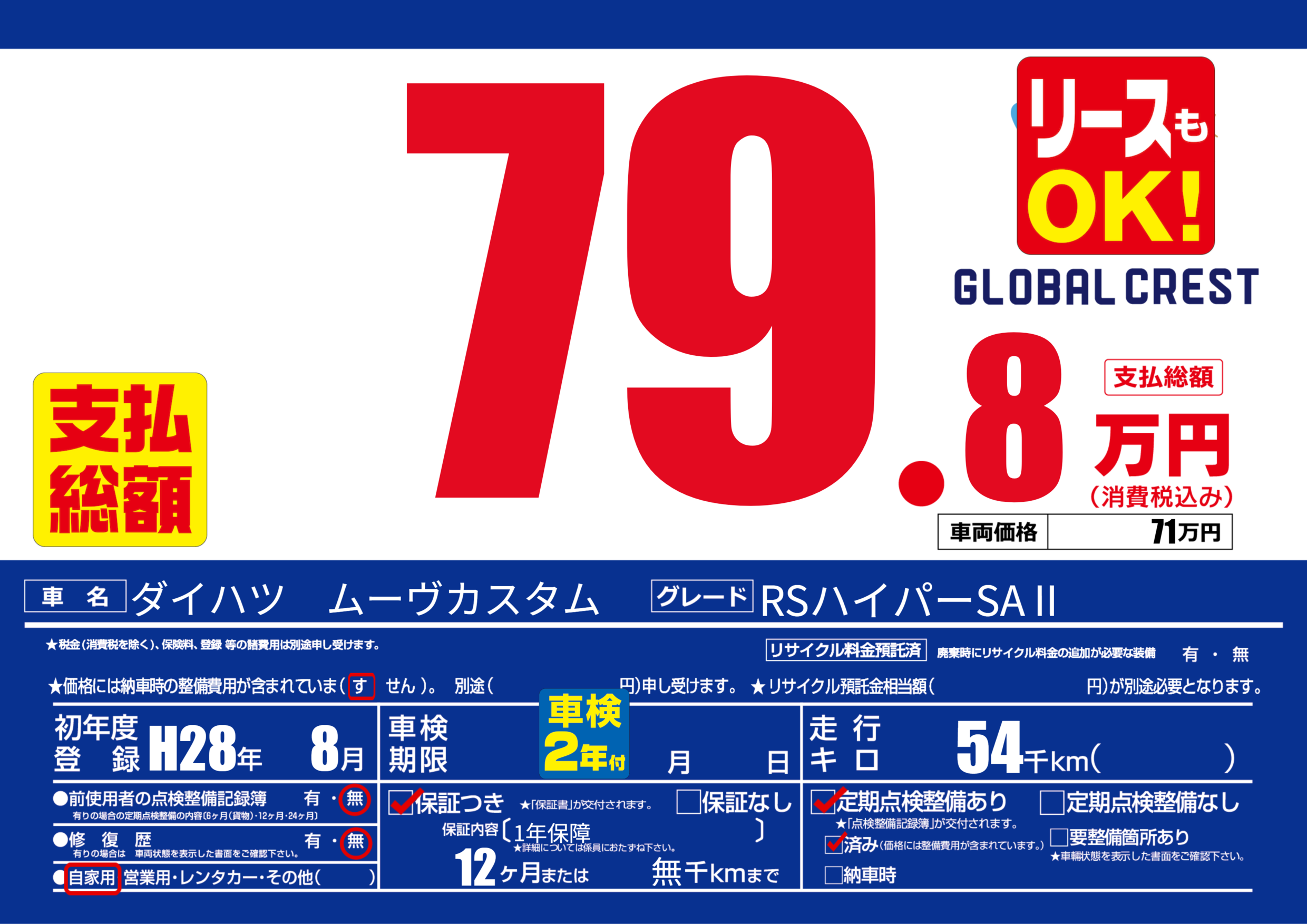 | 走行キロ | 5.4万km | 初年度登録 | H28年8月 |