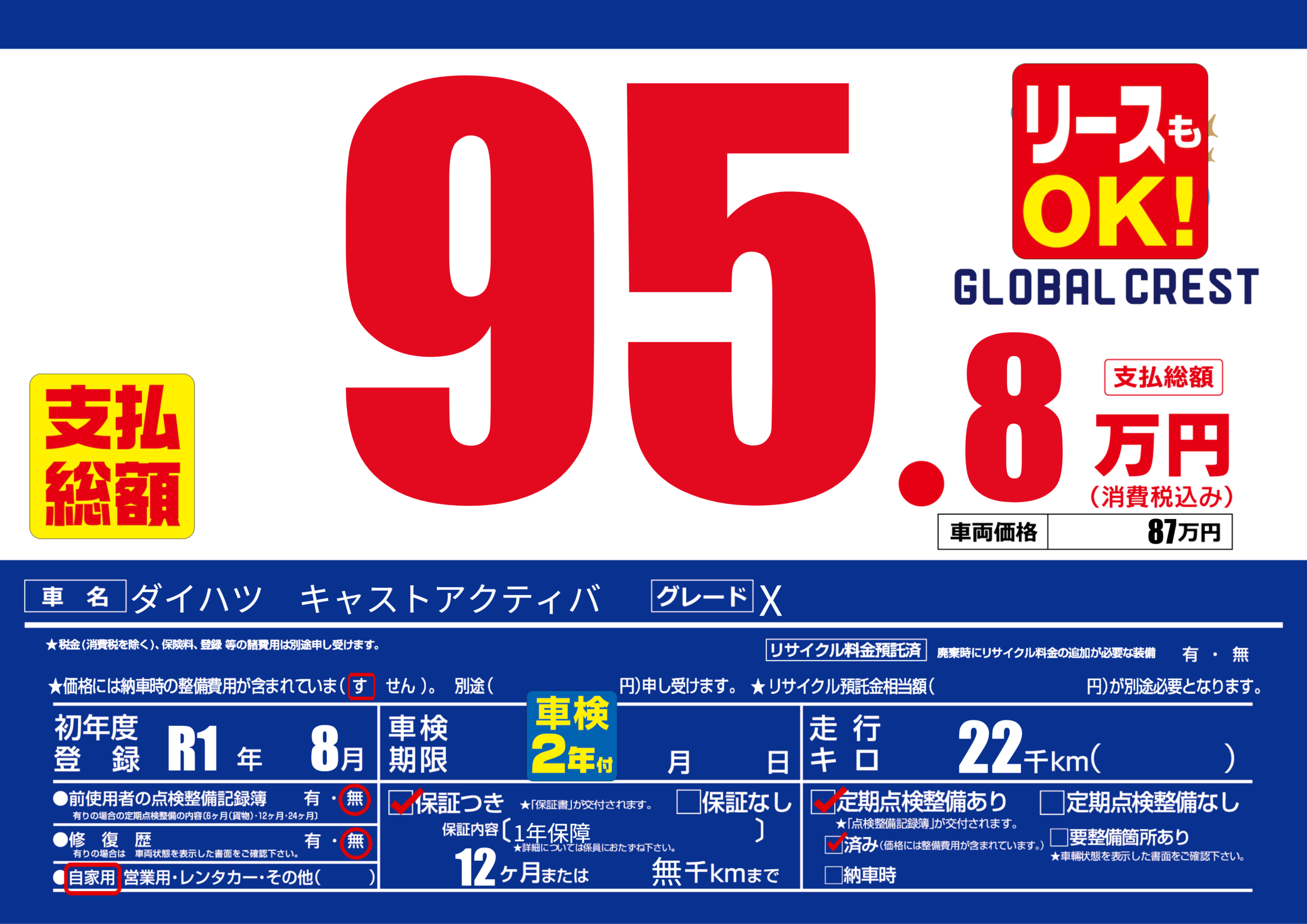 | 定期点検整備 | 定期点検整備あり 定期点検整備済み | ||