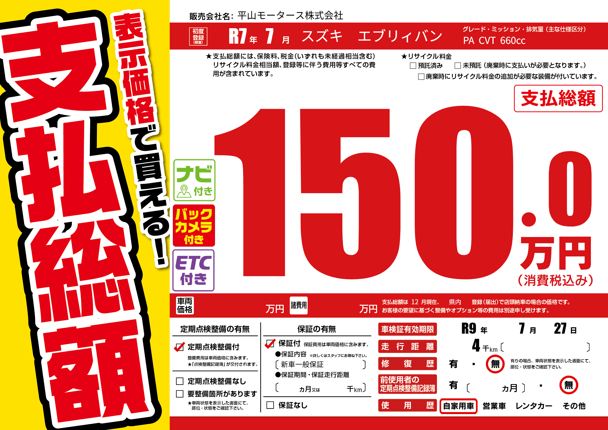 | 走行キロ | 0.4万km | 初年度登録 | R7年7月 |