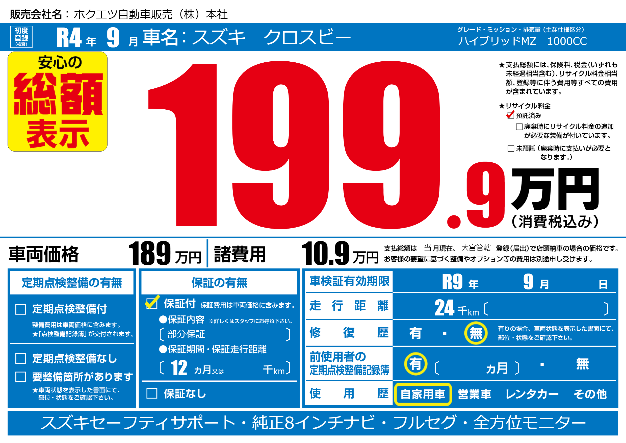 | 車検制限 | R9年 9月 - 日 | ||