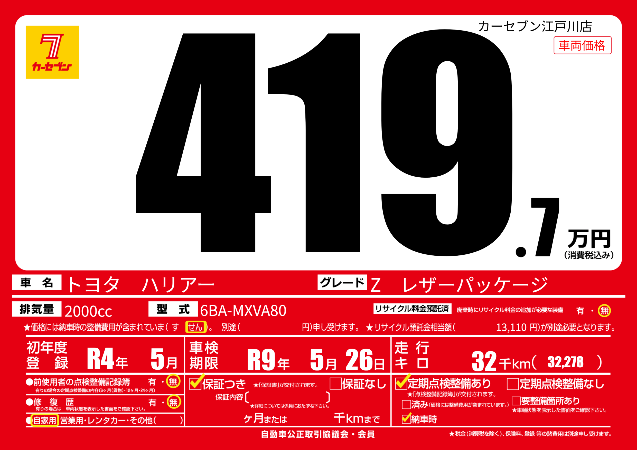 | 車名 | トヨタ ハリアー | グレード ミッション 排気量 |