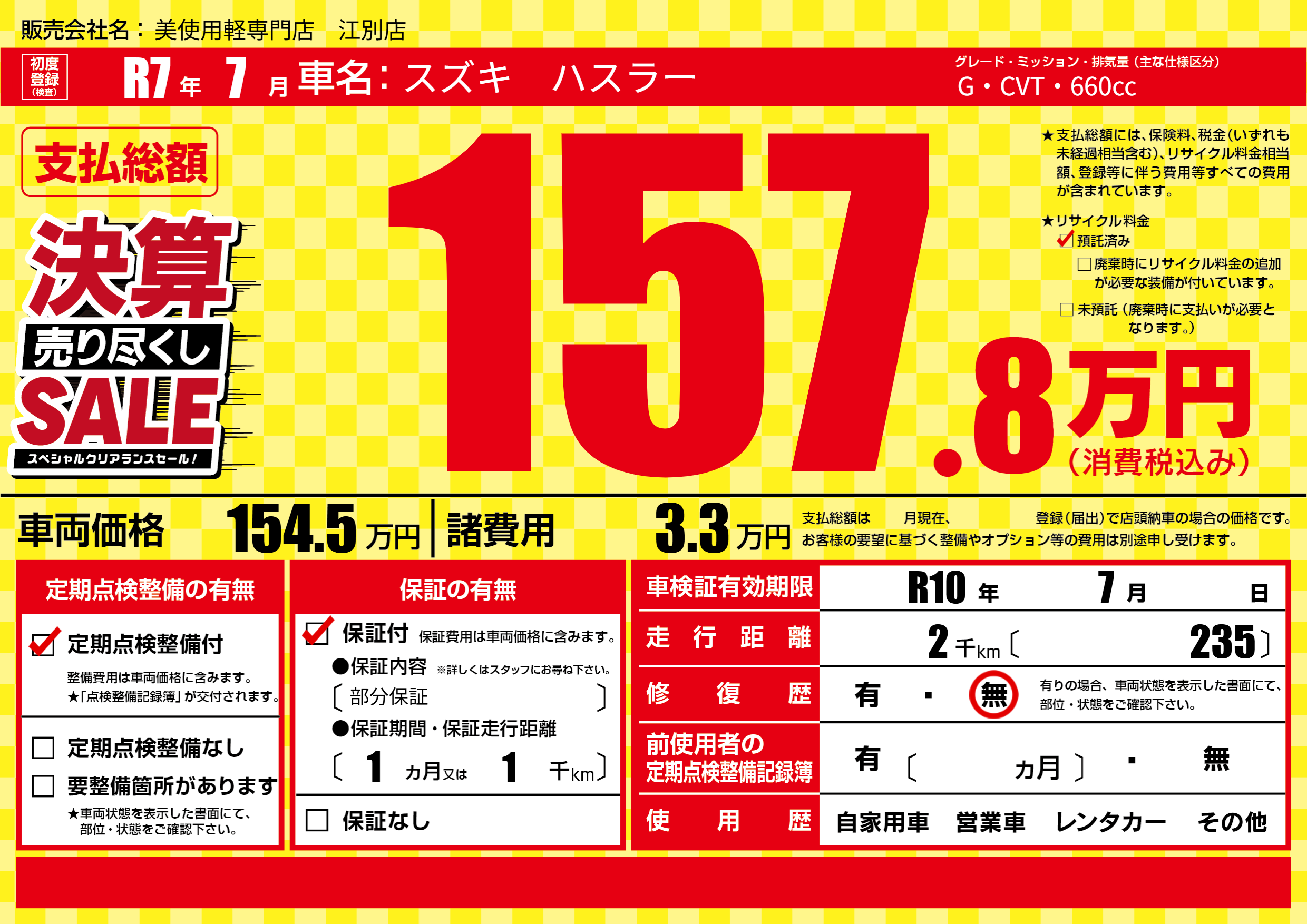 | 走行キロ | 0.2万km | 初年度登録 | R7年7月 |