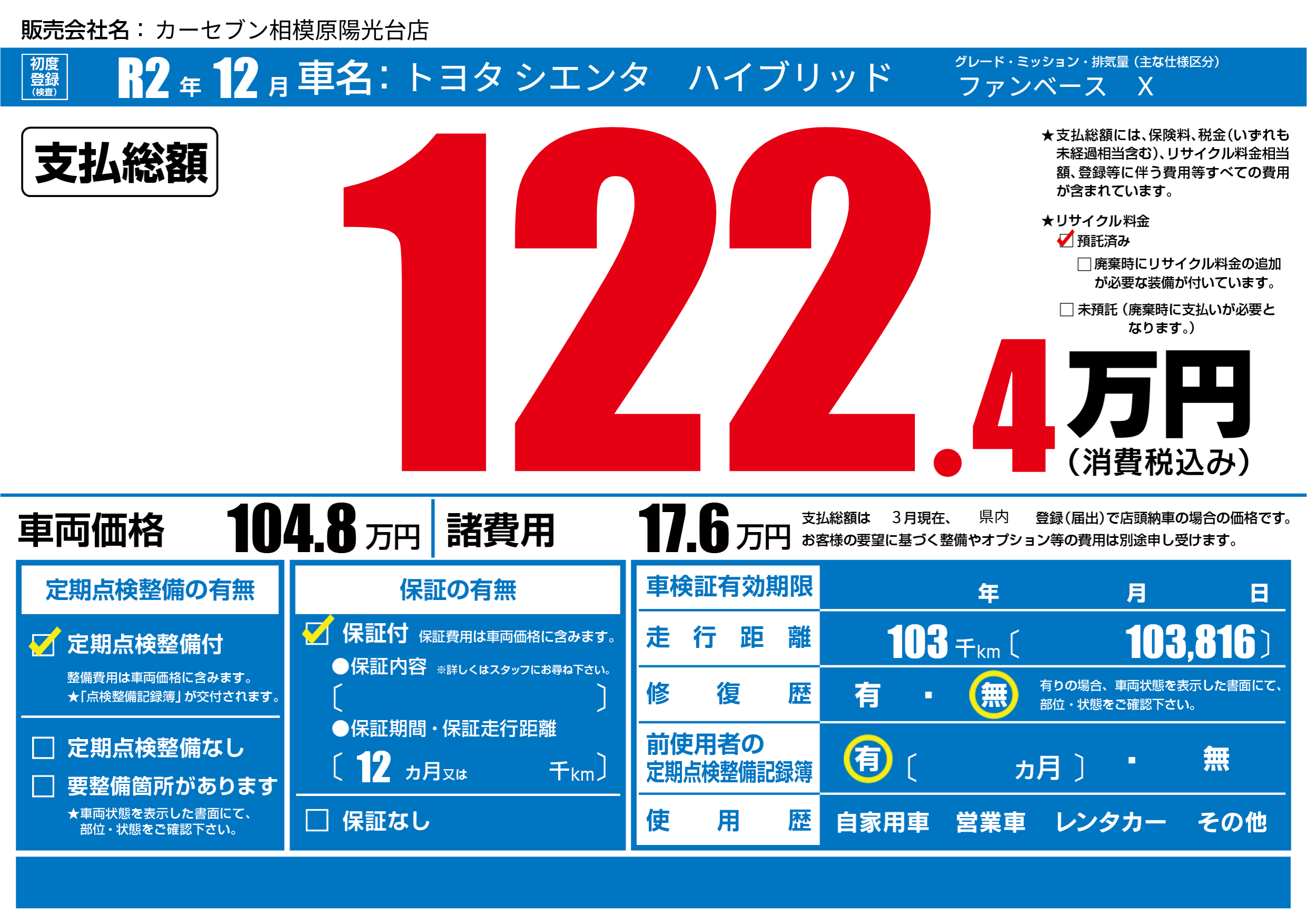 | 車名 | トヨタ シエンタ ハイブリッド | グレード ミッション 排気量 |