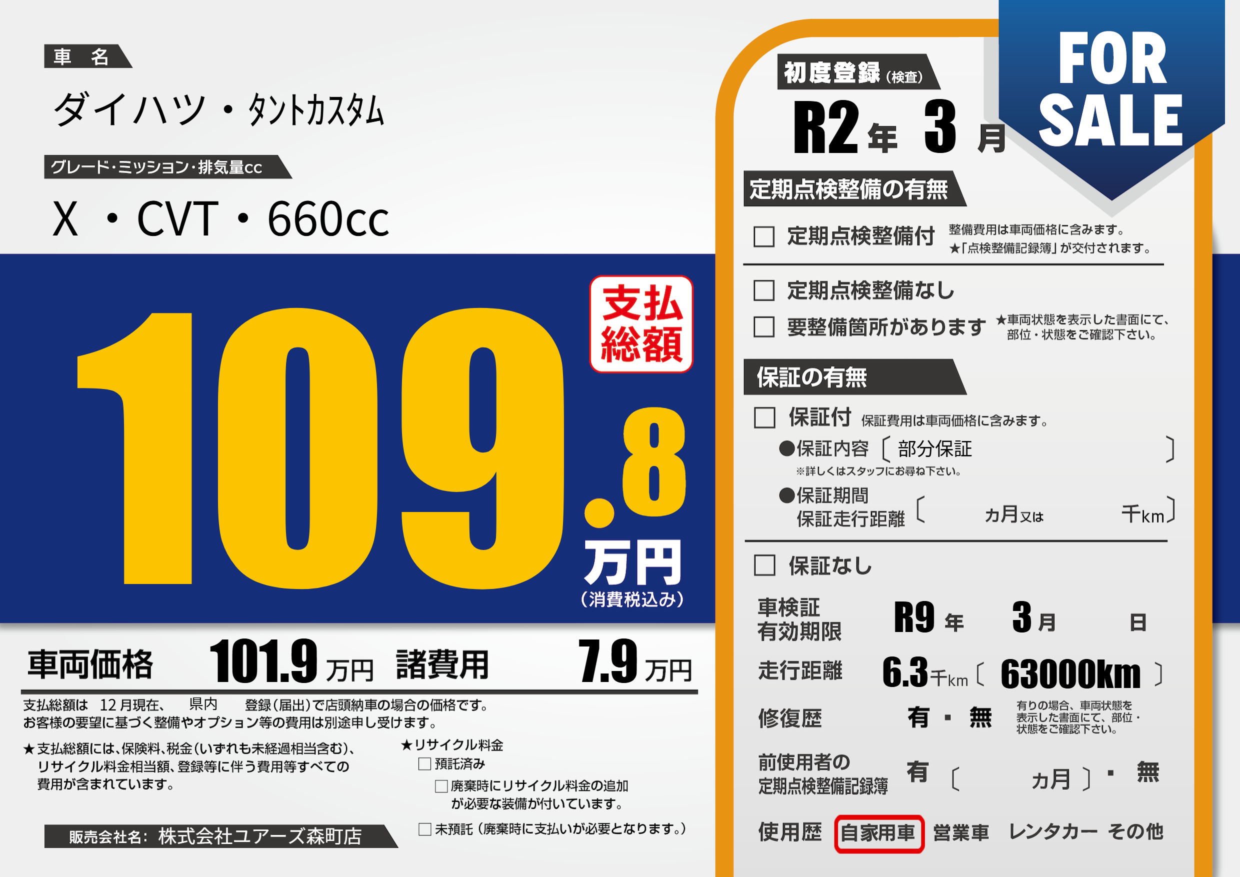 | 車検制限 | R9年 3月 - 日 | ||