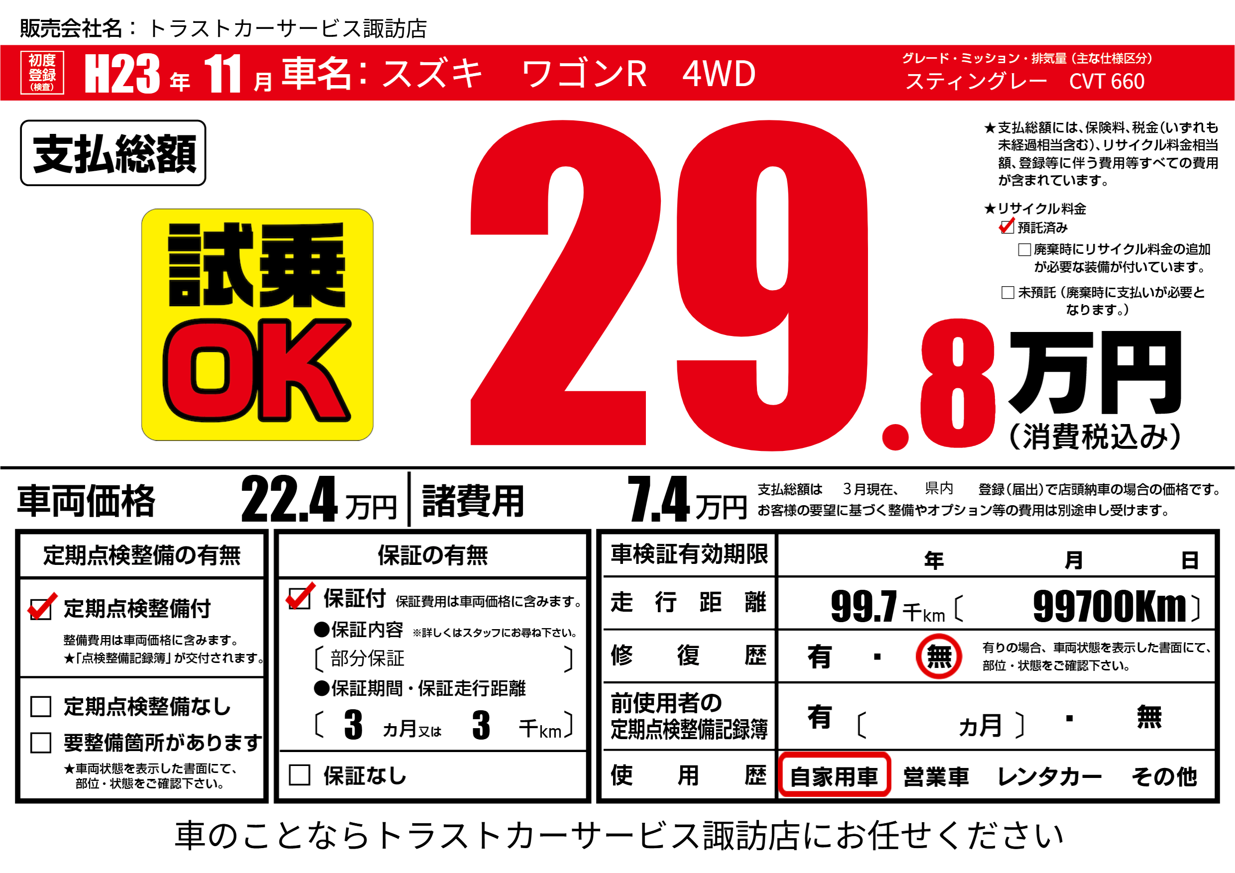 | 走行キロ | 9.9万km | 初年度登録 | H23年11月 |