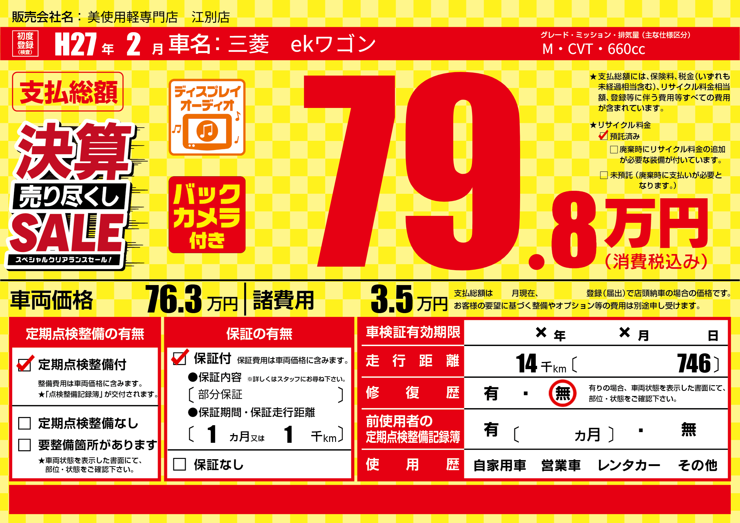 | 車名 | 三菱 ekワゴン | グレード ミッション 排気量 |