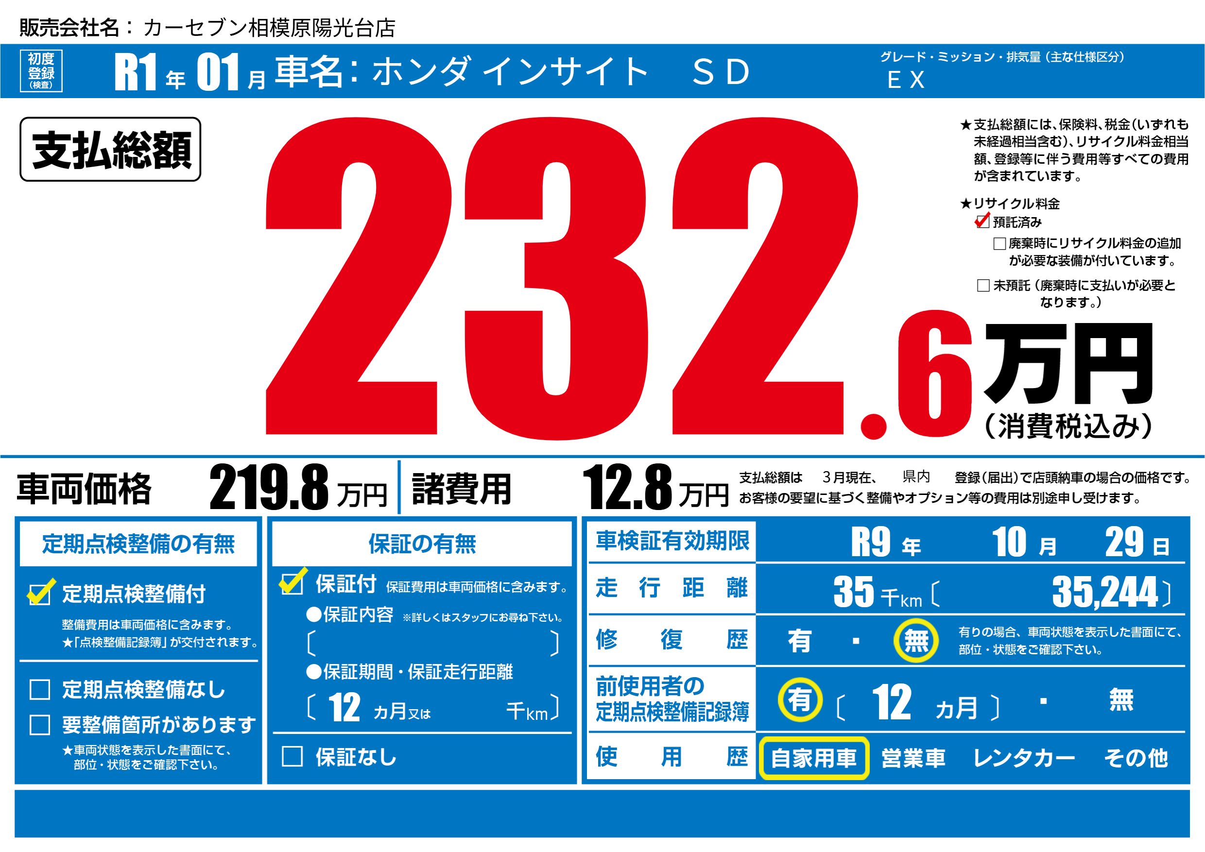 | 車名 | ホンダ インサイト SD | グレード ミッション 排気量 |