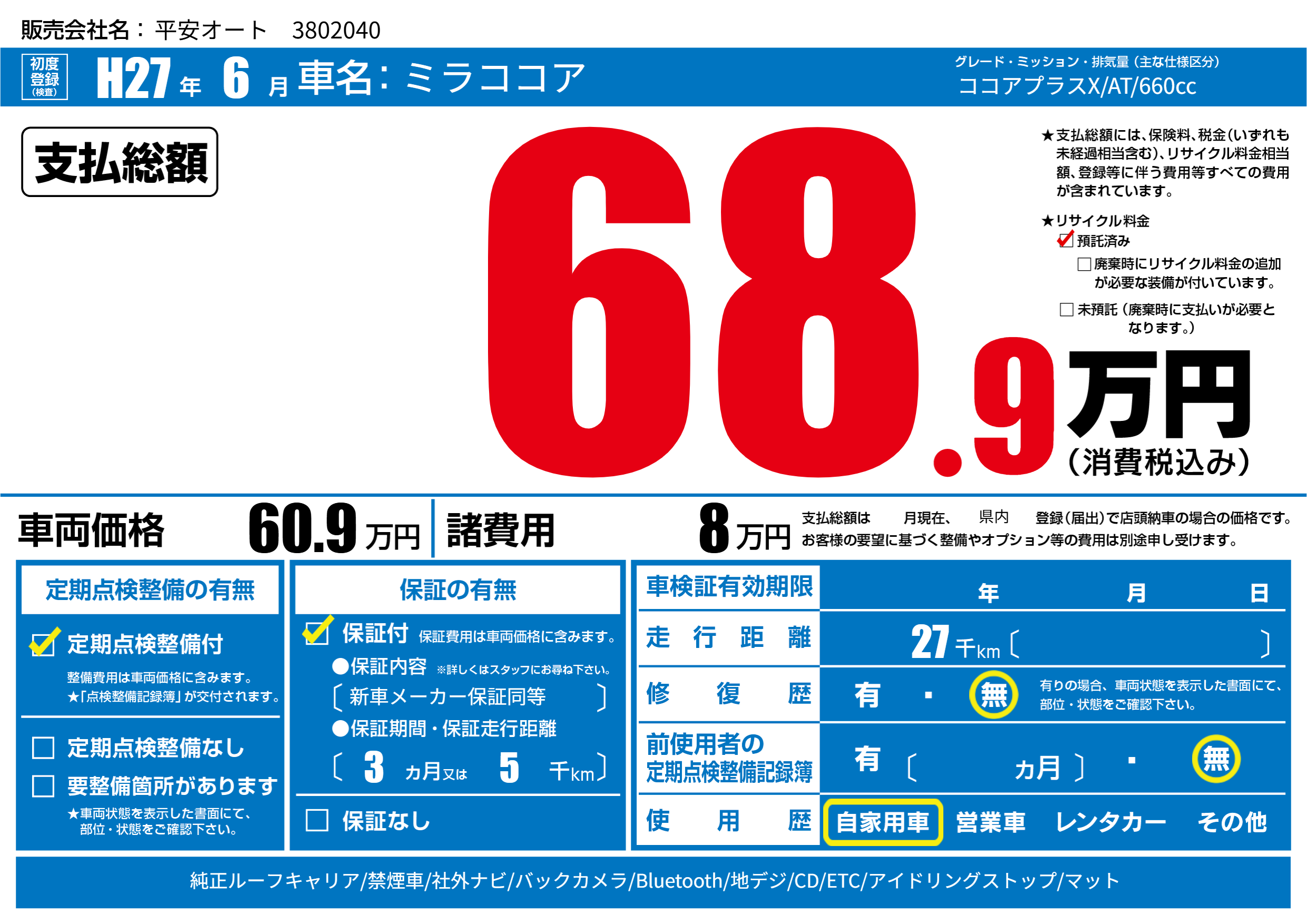 | 走行キロ | 2.7万km | 初年度登録 | H27年6月 |