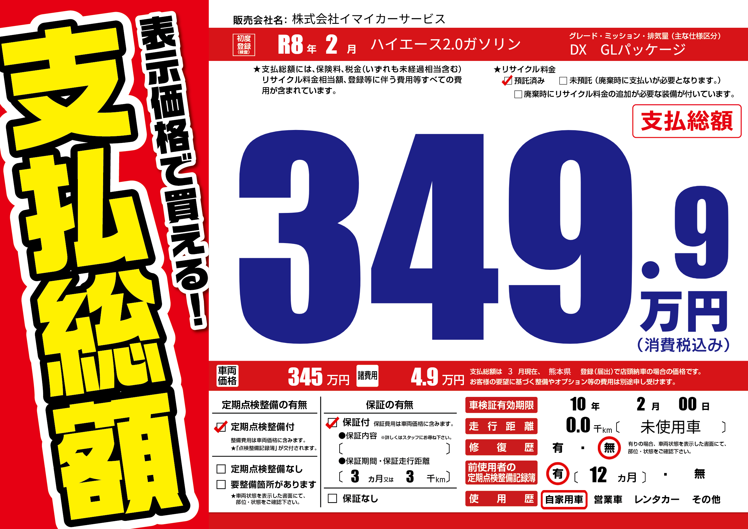 | 車名 | ハイエース2.0ガソリン | グレード ミッション 排気量 |