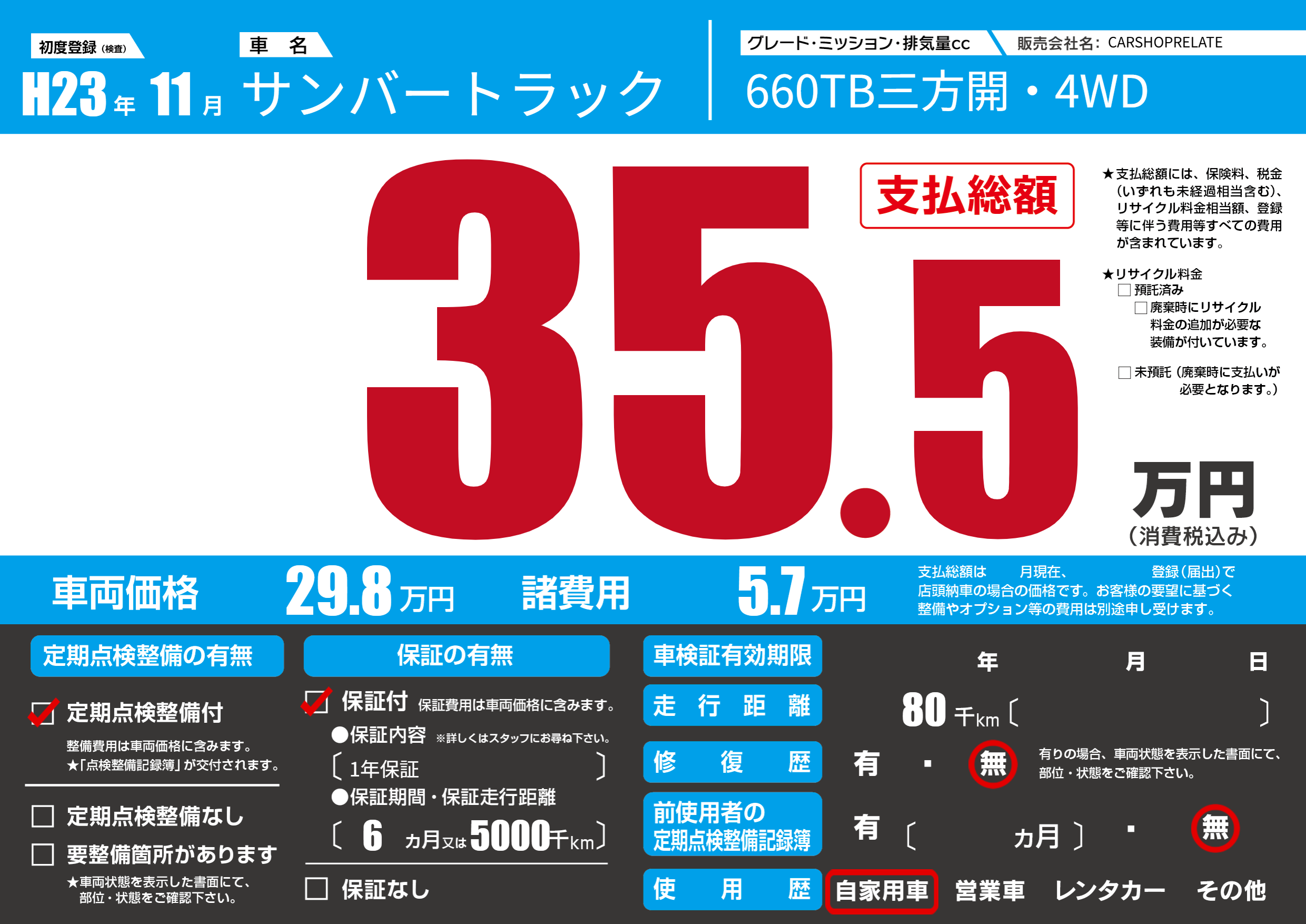 | 走行キロ | 8万km | 初年度登録 | H23年11月 |