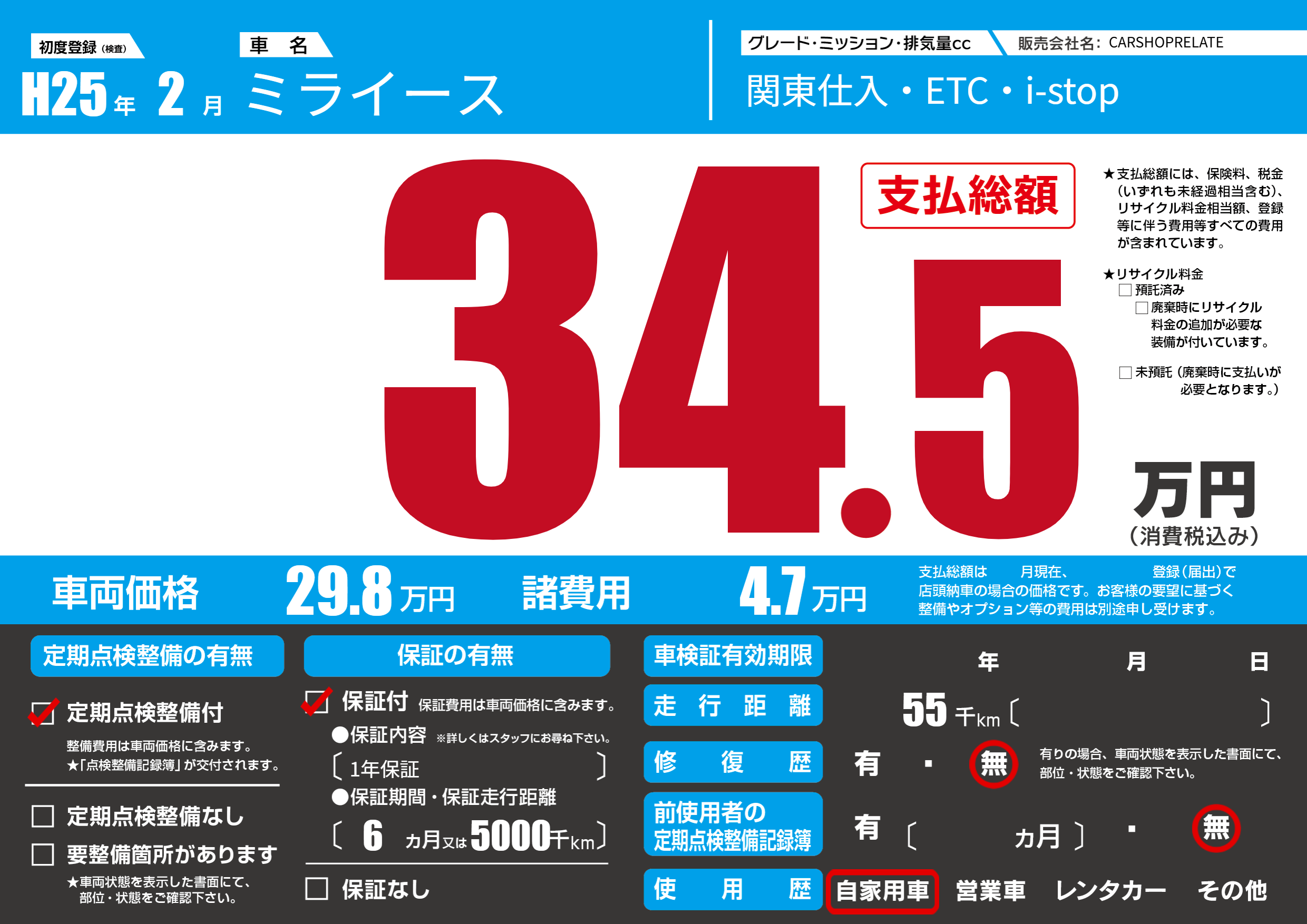 | 走行キロ | 5.5万km | 初年度登録 | H25年2月 |