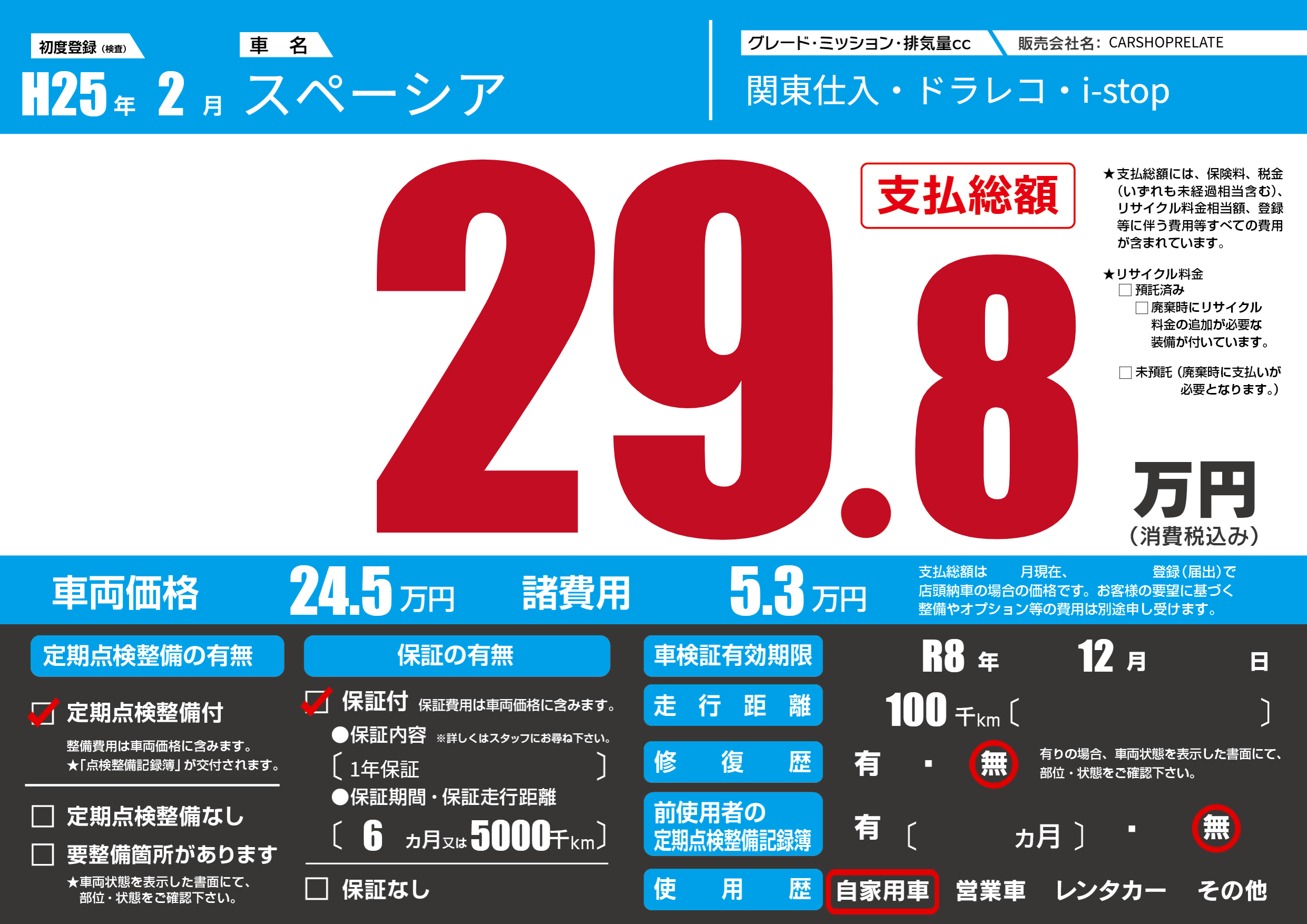 | 走行キロ | 10万km | 初年度登録 | H25年2月 |