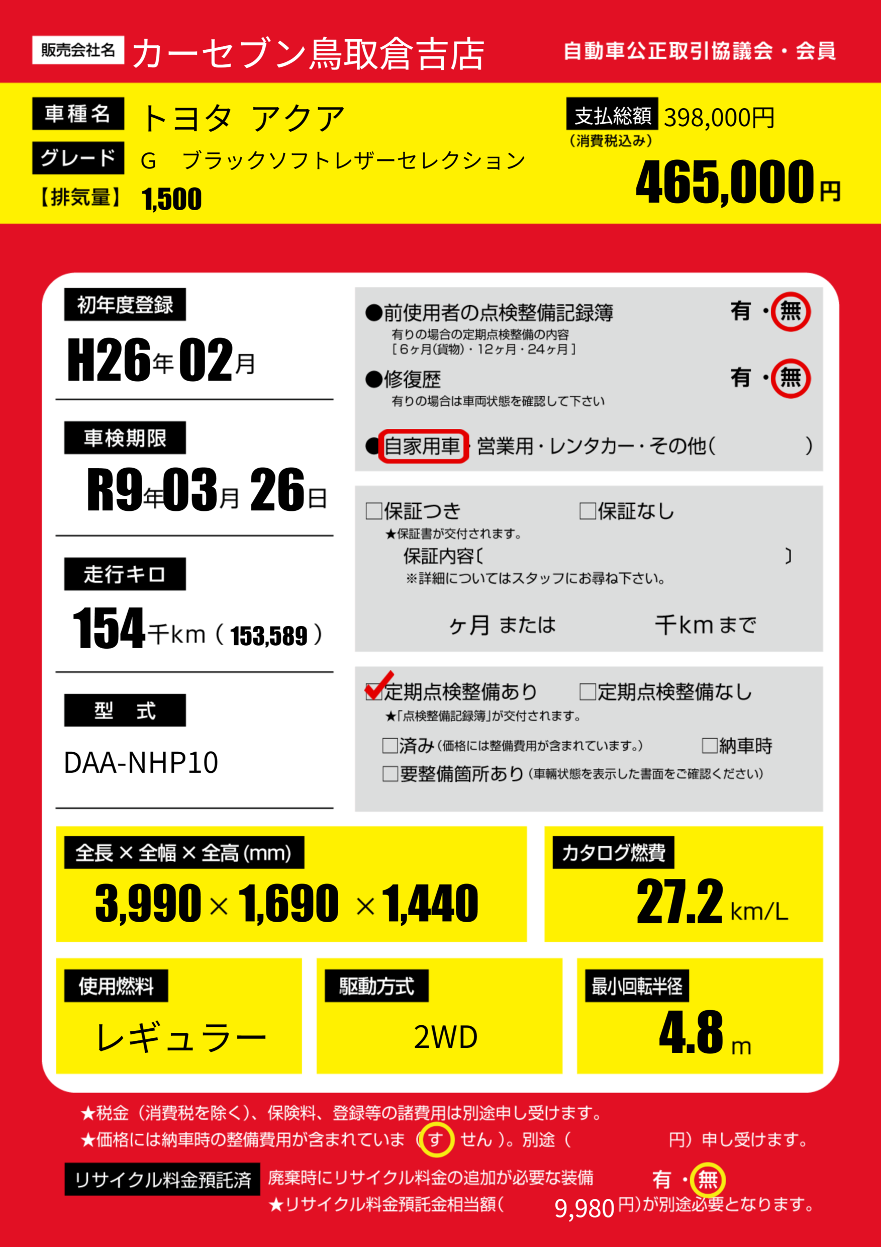 | 車検制限 | R9年 03月 26日 | ||