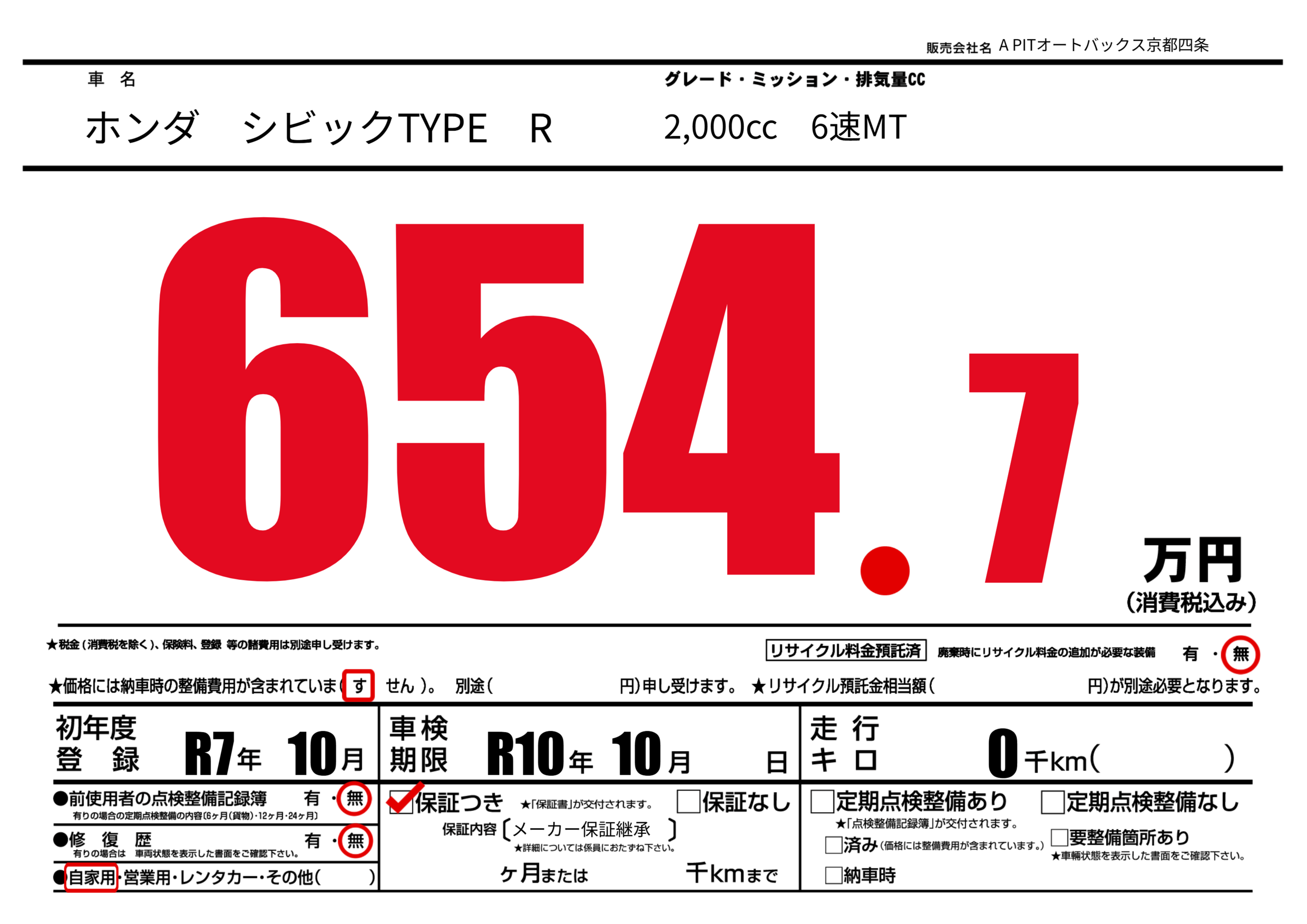 | 車名 | ホンダ シビックTYPE R | グレード ミッション 排気量 |