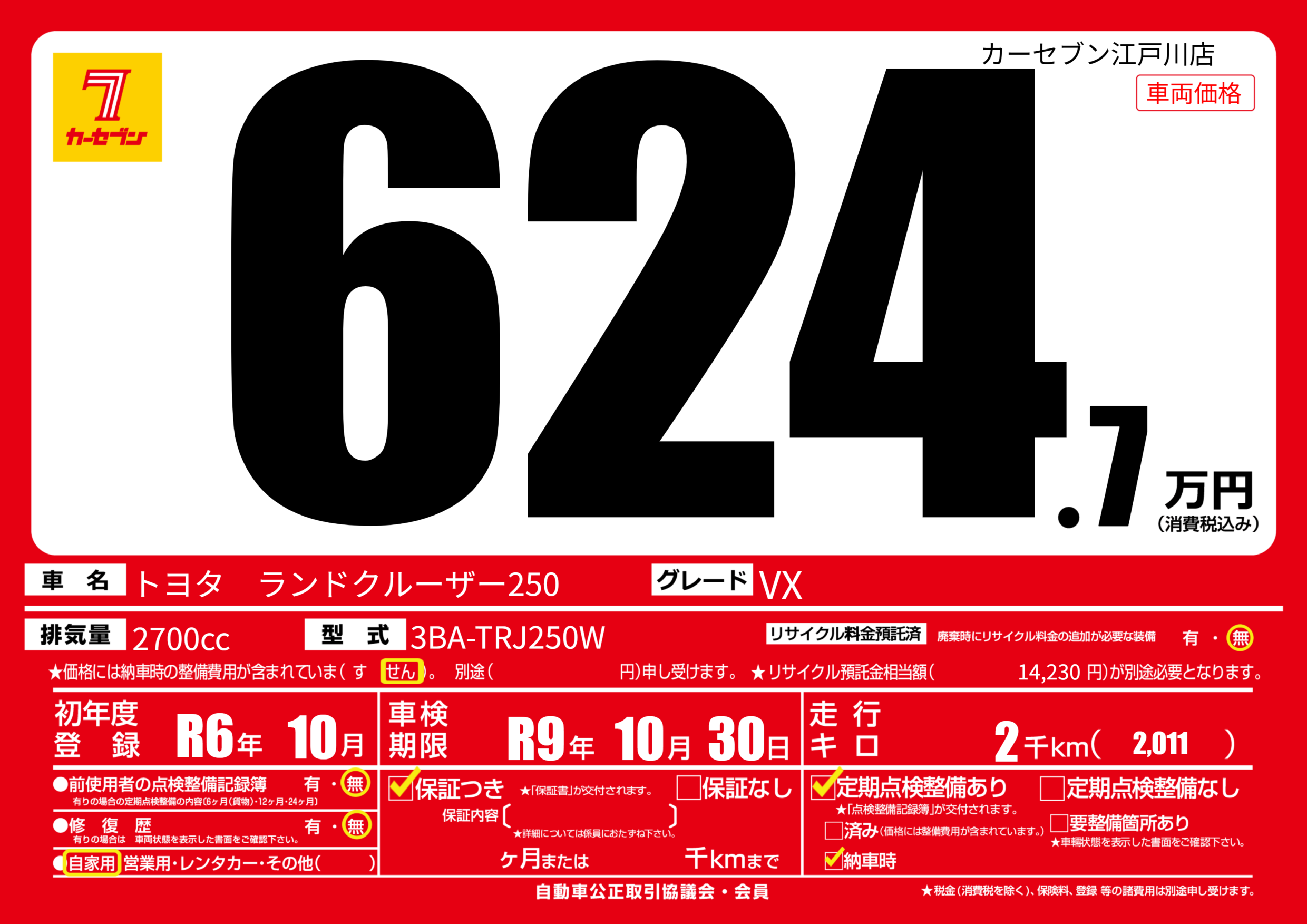 | 車名 | トヨタ ランドクルーザー250 | グレード ミッション 排気量 |