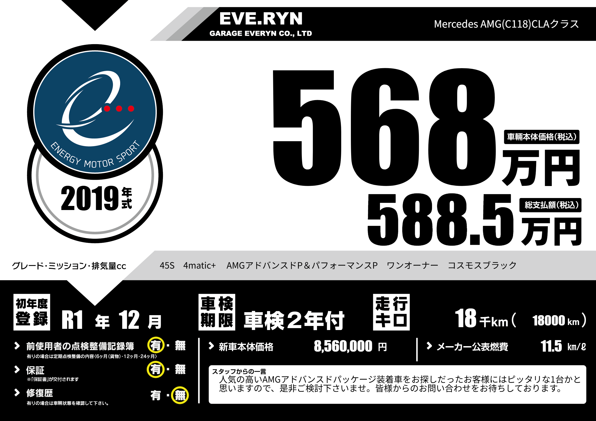 | 車名 | Mercedes AMG(C118)CLAクラス | グレード ミッション 排気量 |