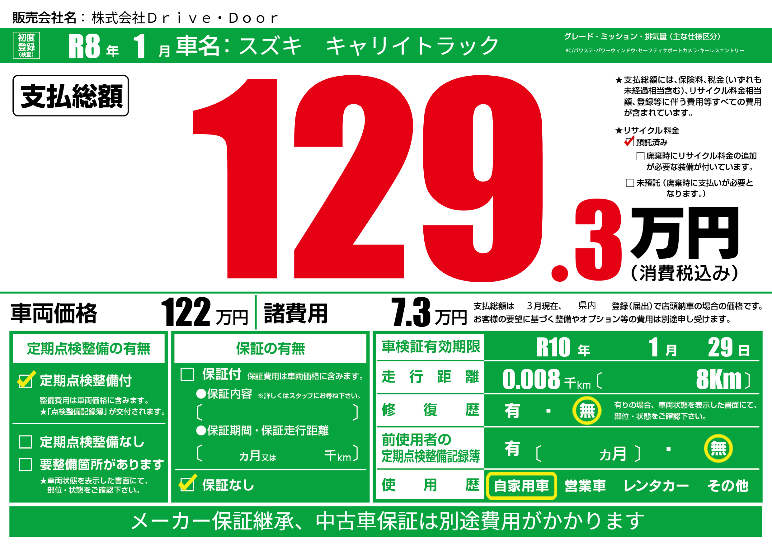 | 走行キロ | - | 初年度登録 | R8年1月 |