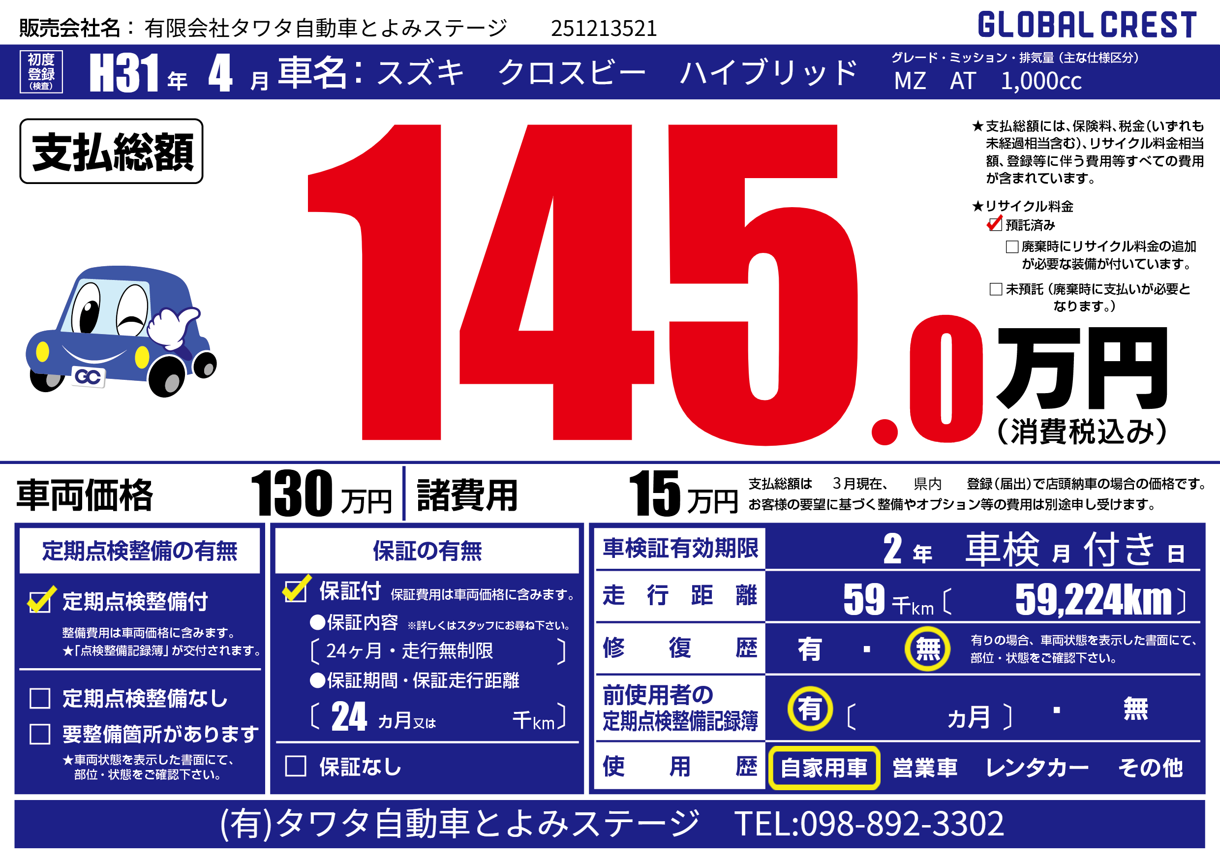 | 車名 | スズキ クロスビー ハイブリッド | グレード ミッション 排気量 |