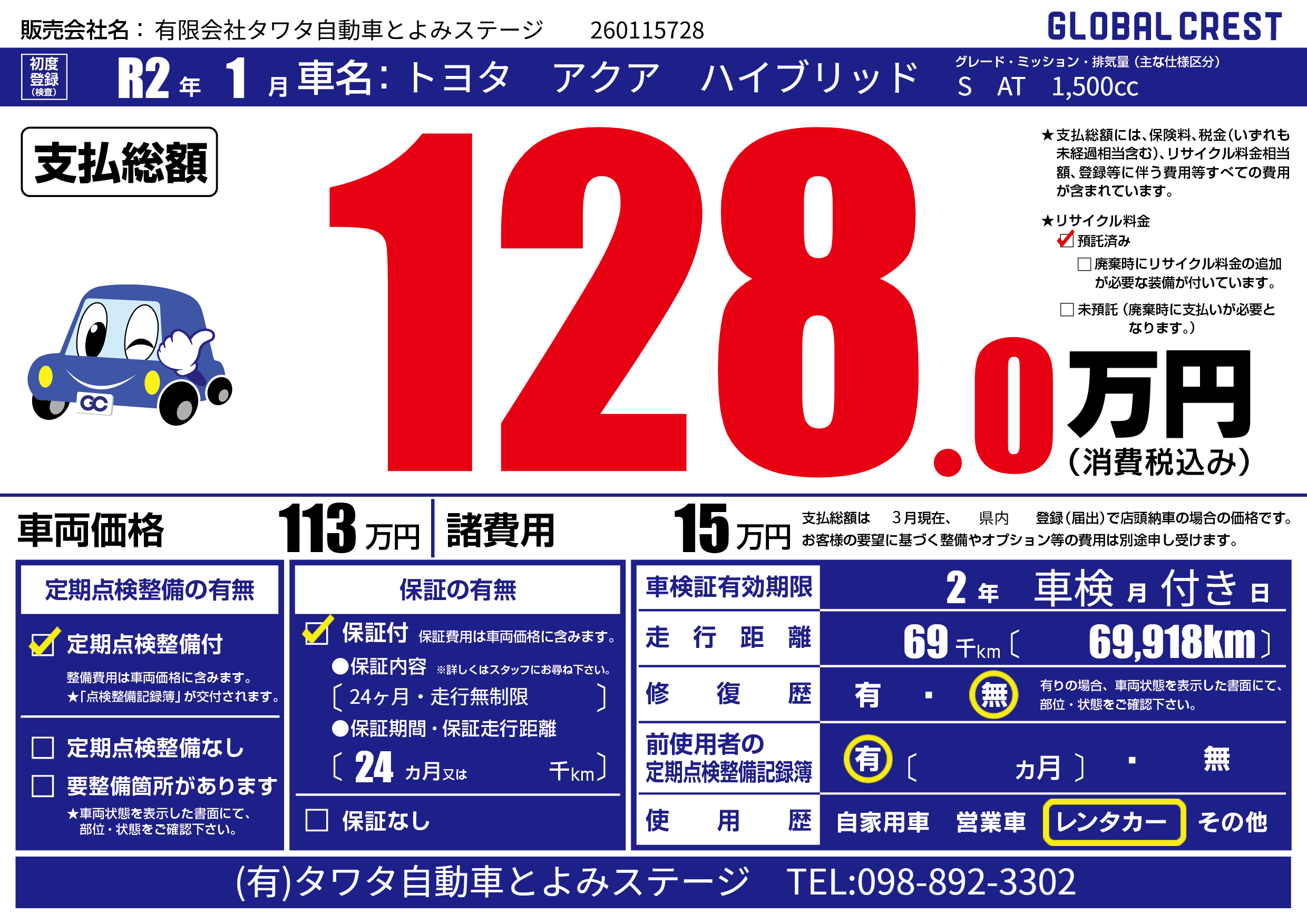 | 走行キロ | 6.9万km | 初年度登録 | R2年1月 |