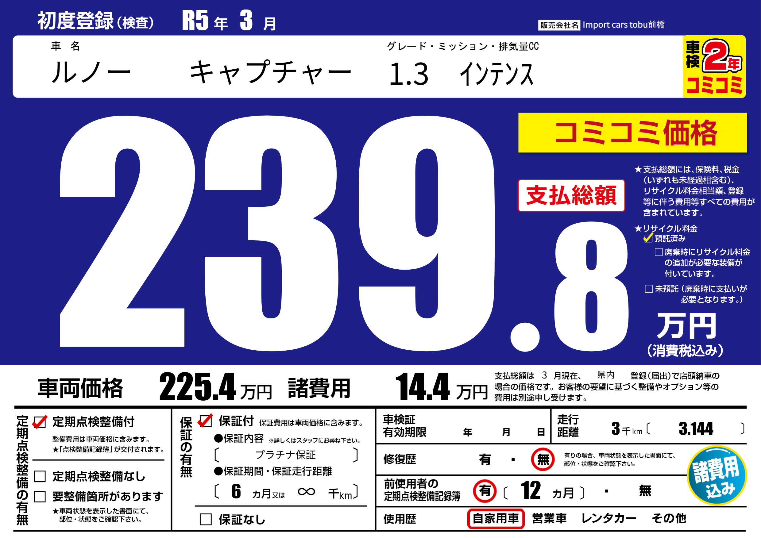 保証付き 保証内容( プラチナ保証) 6ヶ月または(∞)千kmまで |