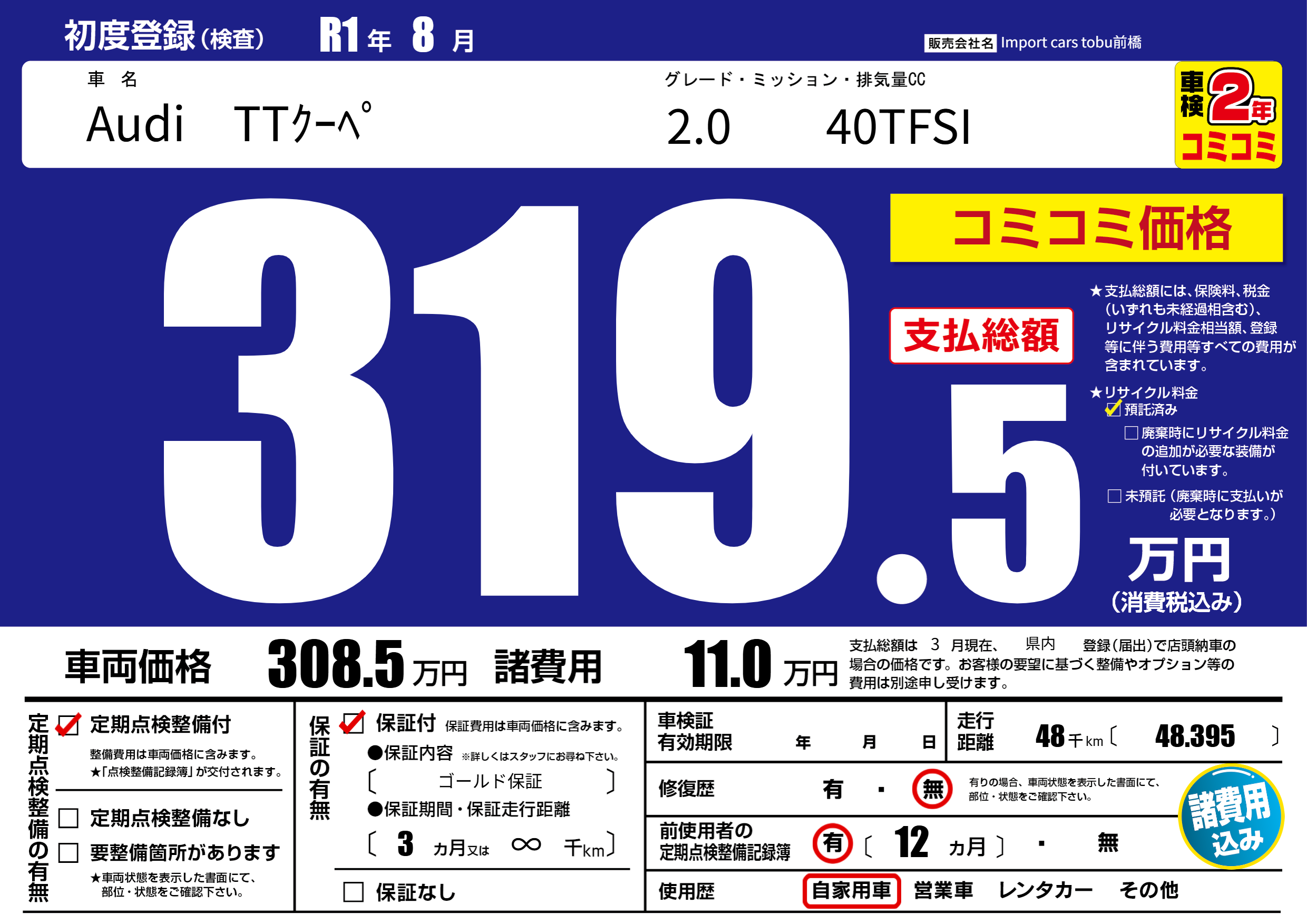 | 車名 | Audi TTクーペ | グレード ミッション 排気量 |