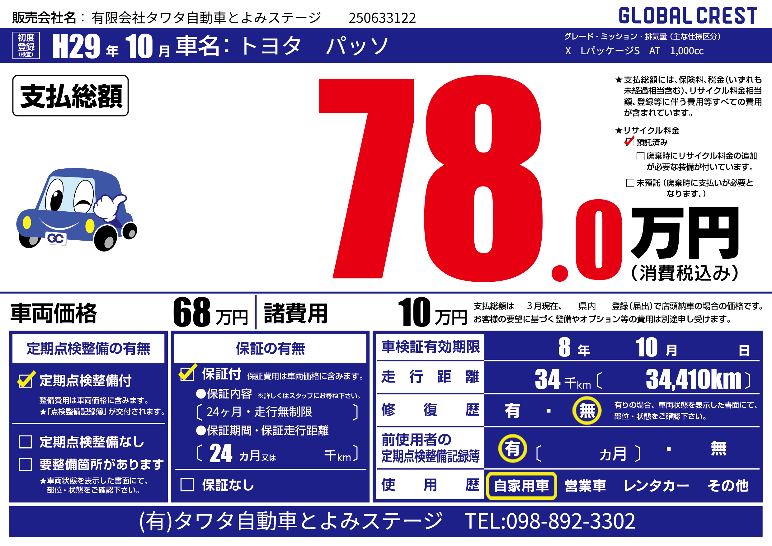 | 車名 | トヨタ パッソ | グレード ミッション 排気量 |