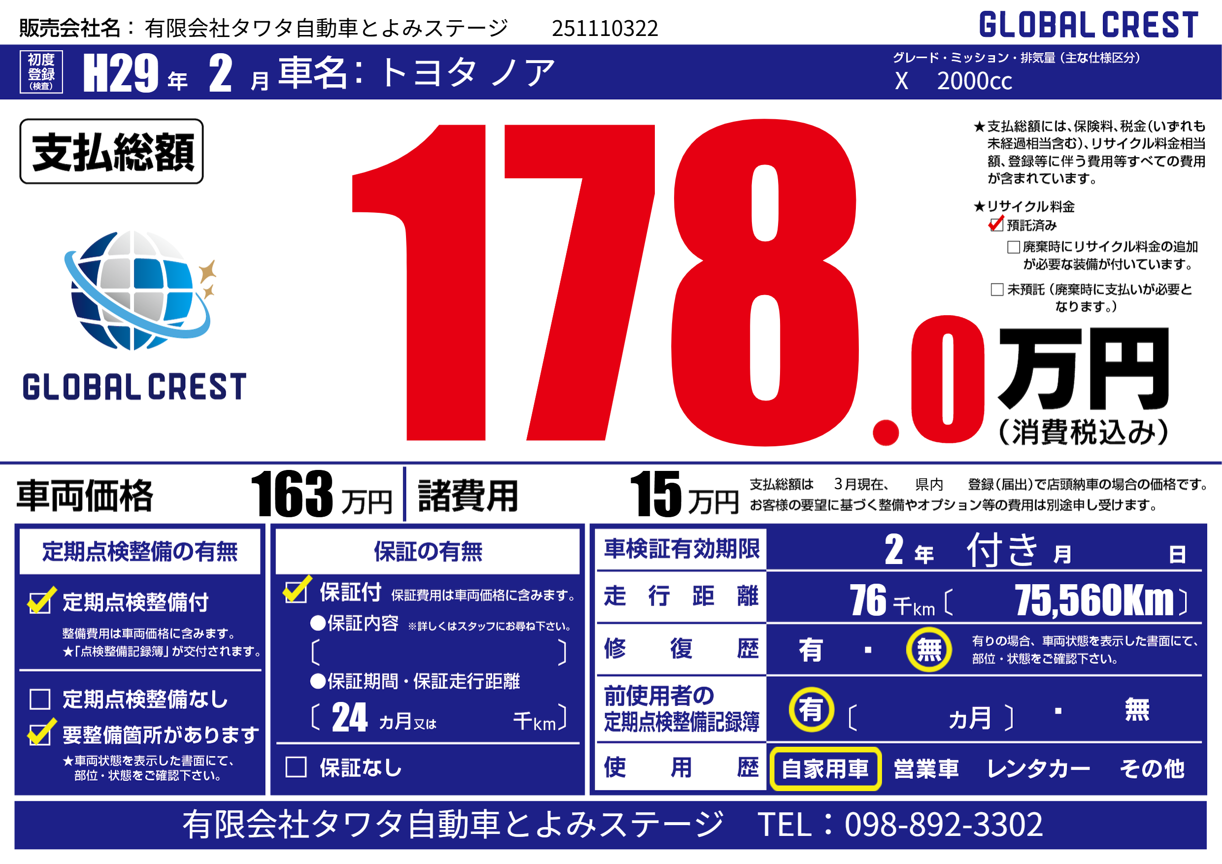 | 走行キロ | 7.6万km | 初年度登録 | H29年2月 |