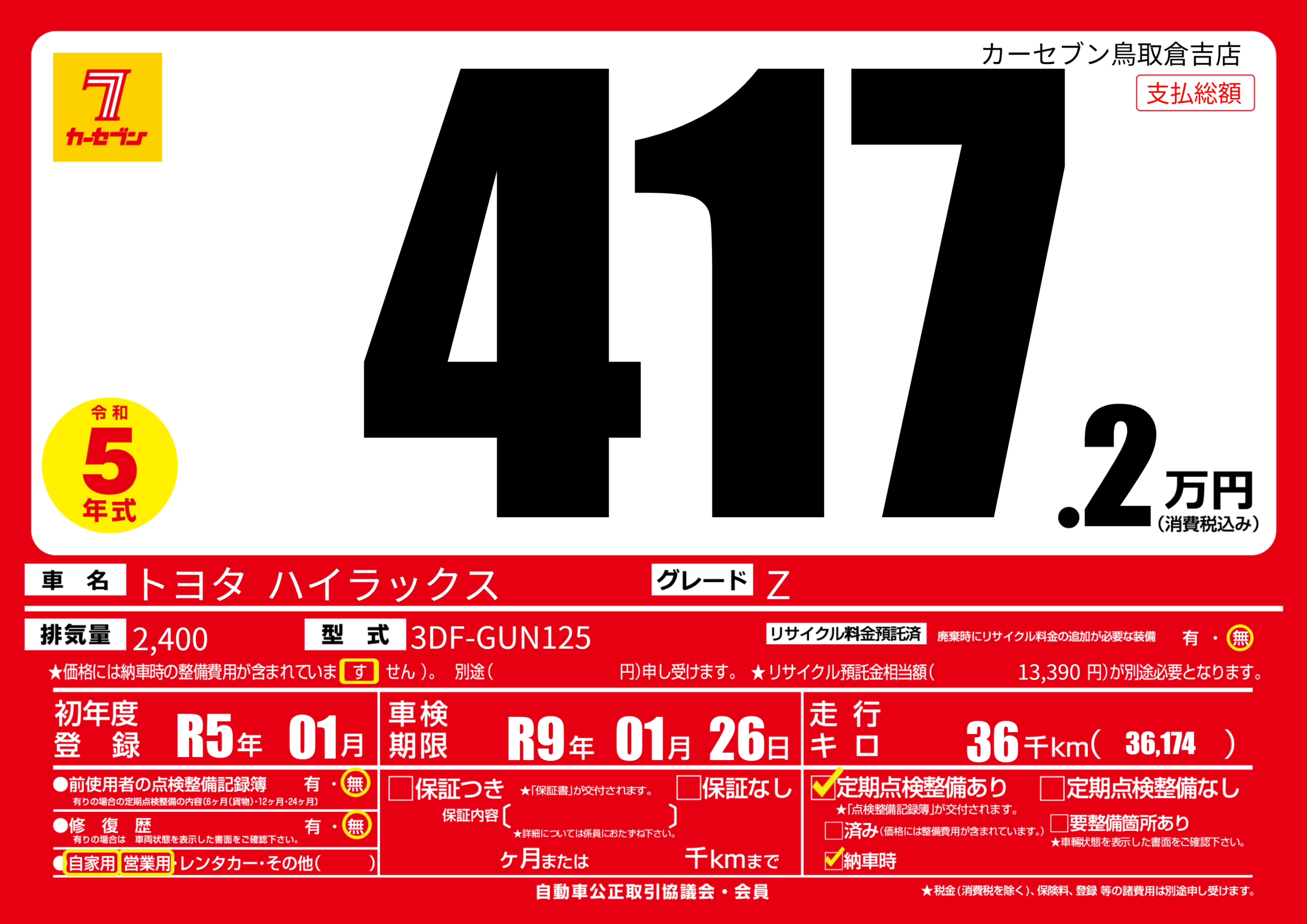 | 走行キロ | 3.6万km | 初年度登録 | R5年01月 |