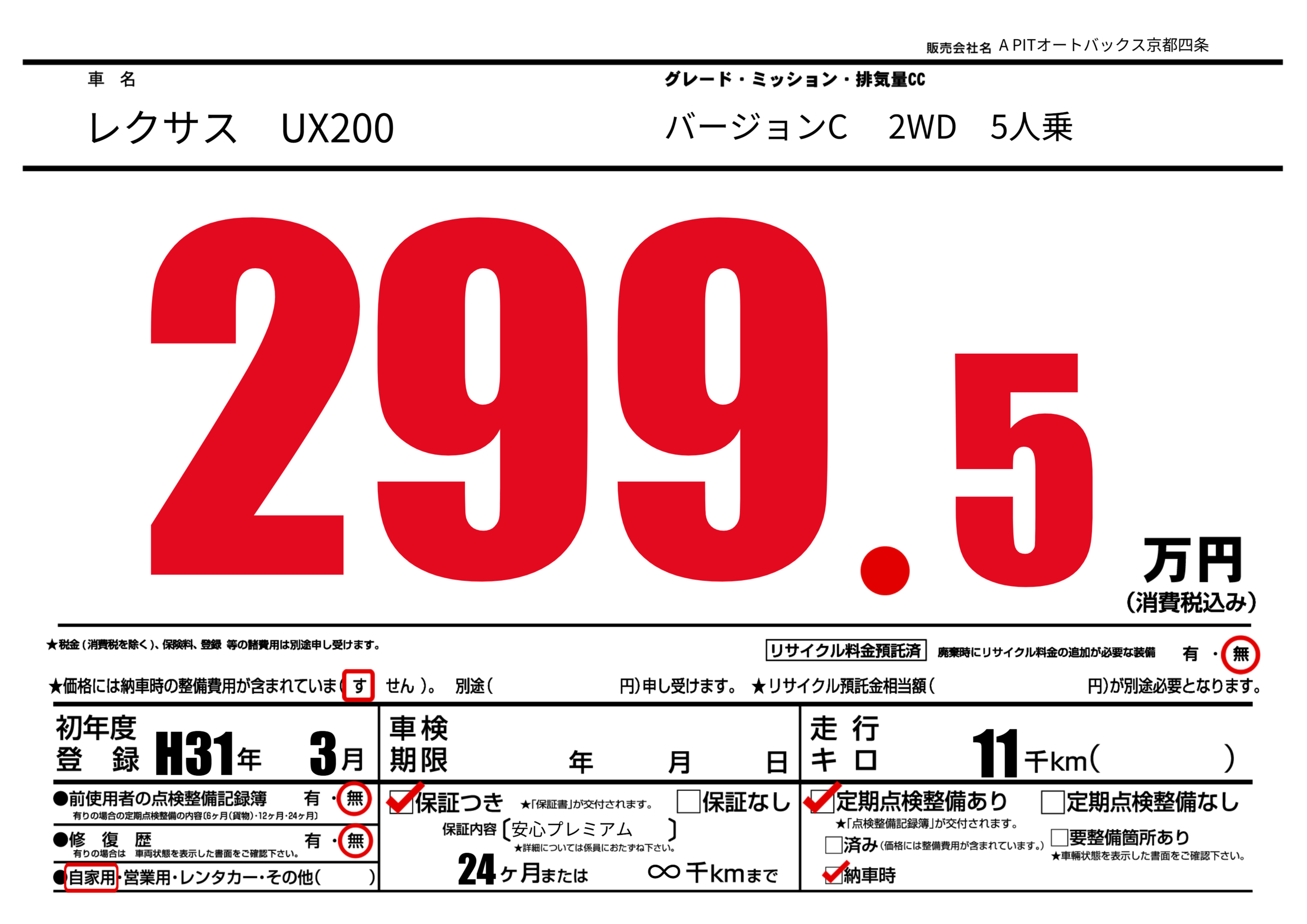 | 車名 | レクサス UX200 | グレード ミッション 排気量 |