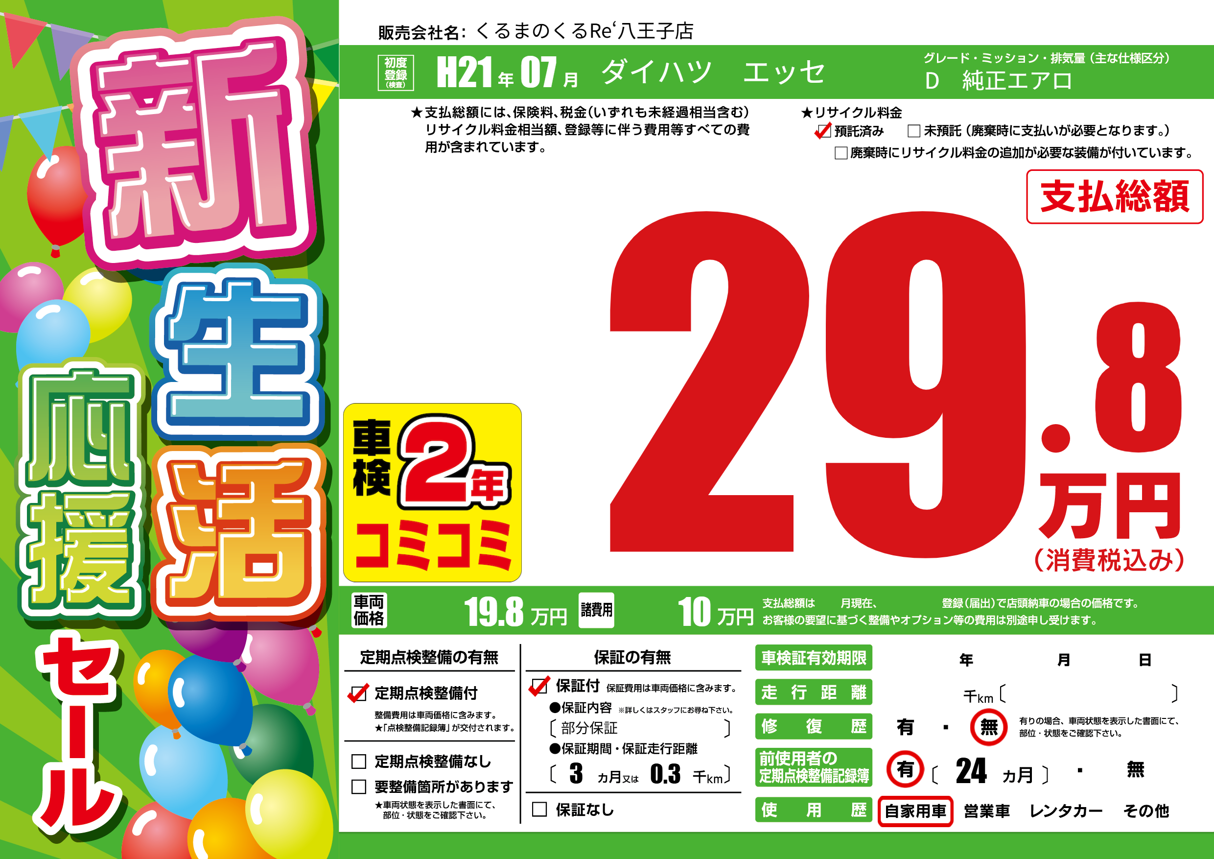 保証付き 保証内容(部分保証) 3ヶ月または(0.3)千kmまで |