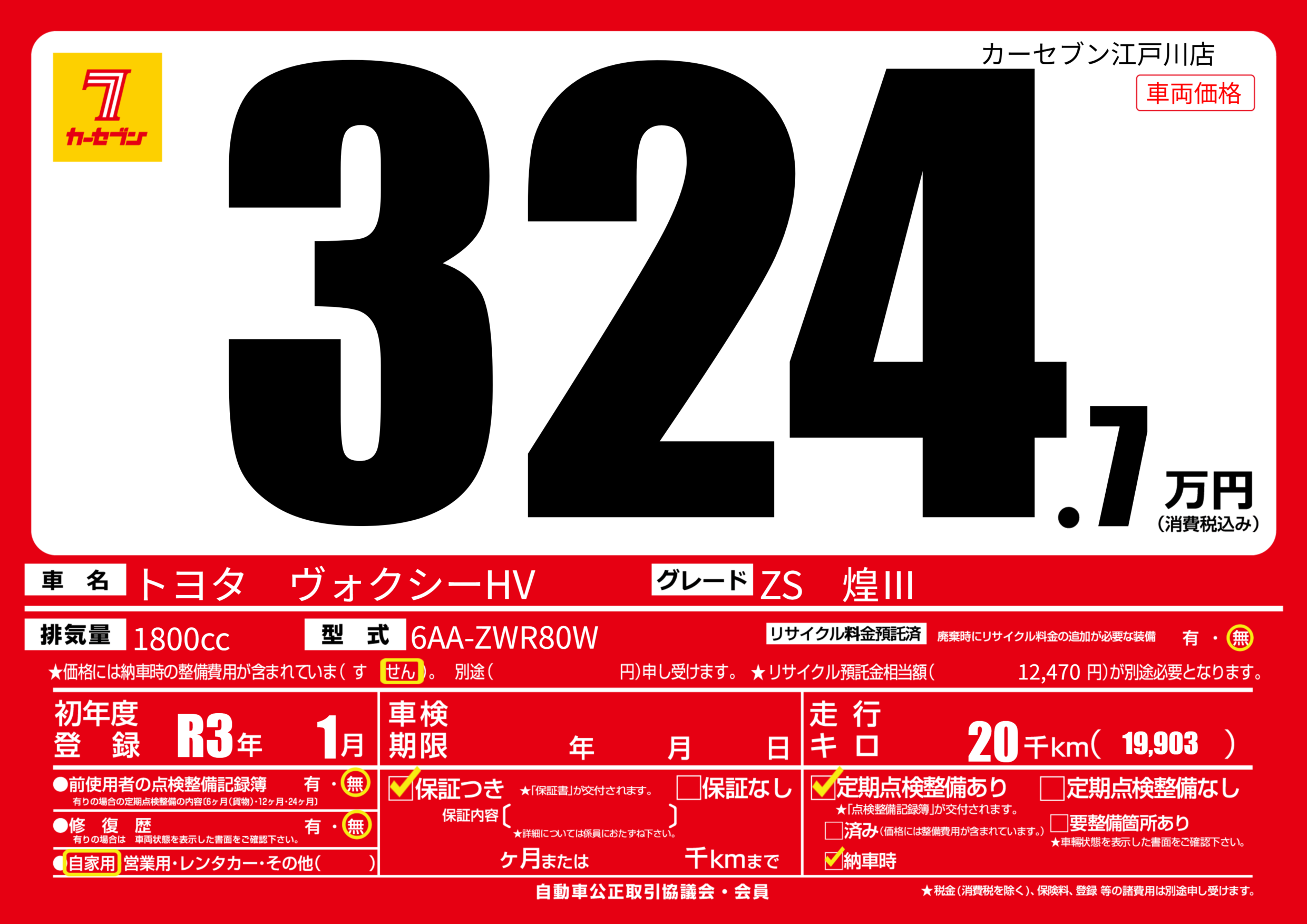 | 車名 | トヨタ ヴォクシーHV | グレード ミッション 排気量 |
