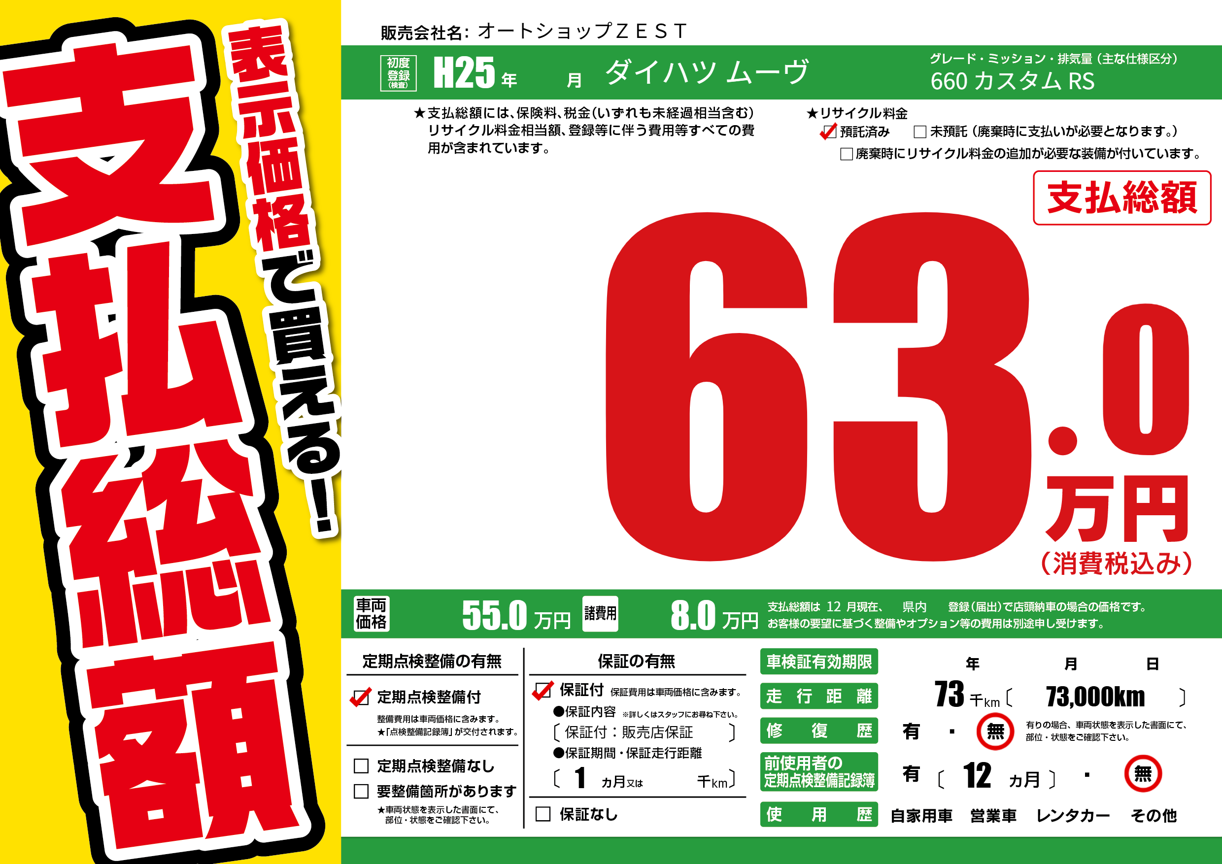 保証なし 保証内容(保証付:販売店保証) 1ヶ月または()千kmまで |