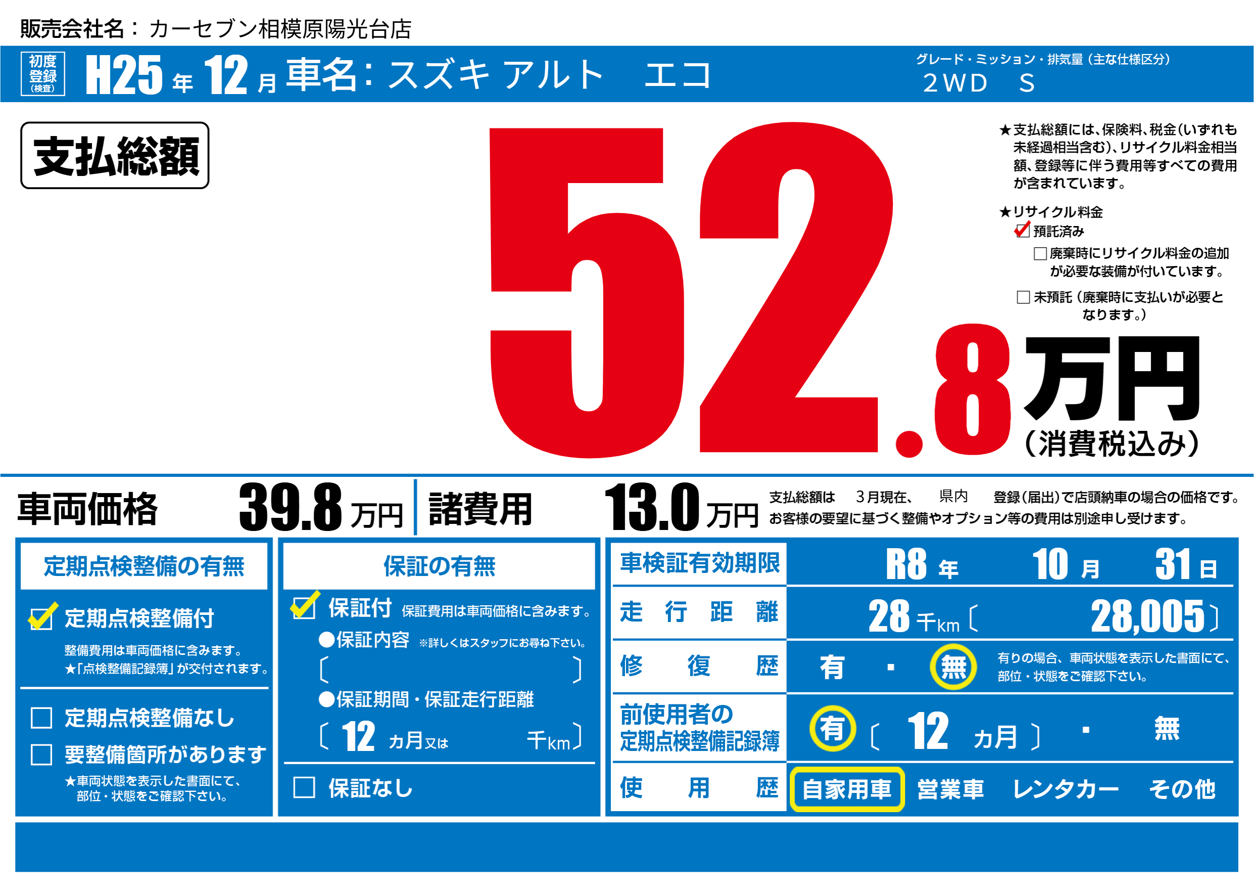 | 車検制限 | R8年 10月 31日 | ||