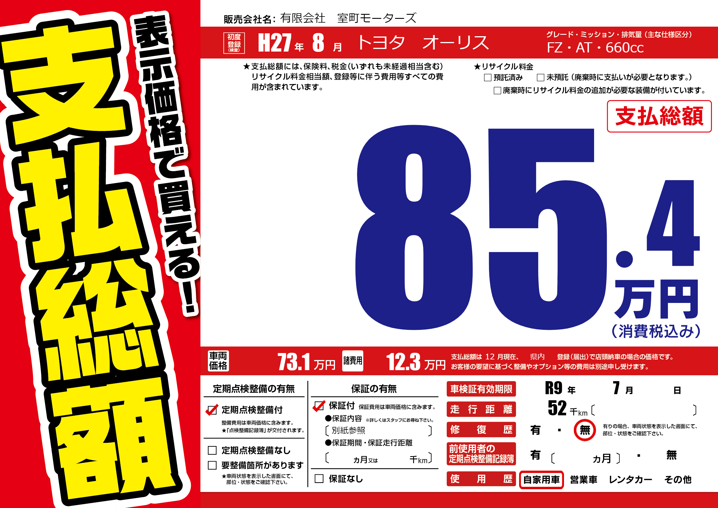 保証付き 保証内容(別紙参照) ---ヶ月または()千kmまで |