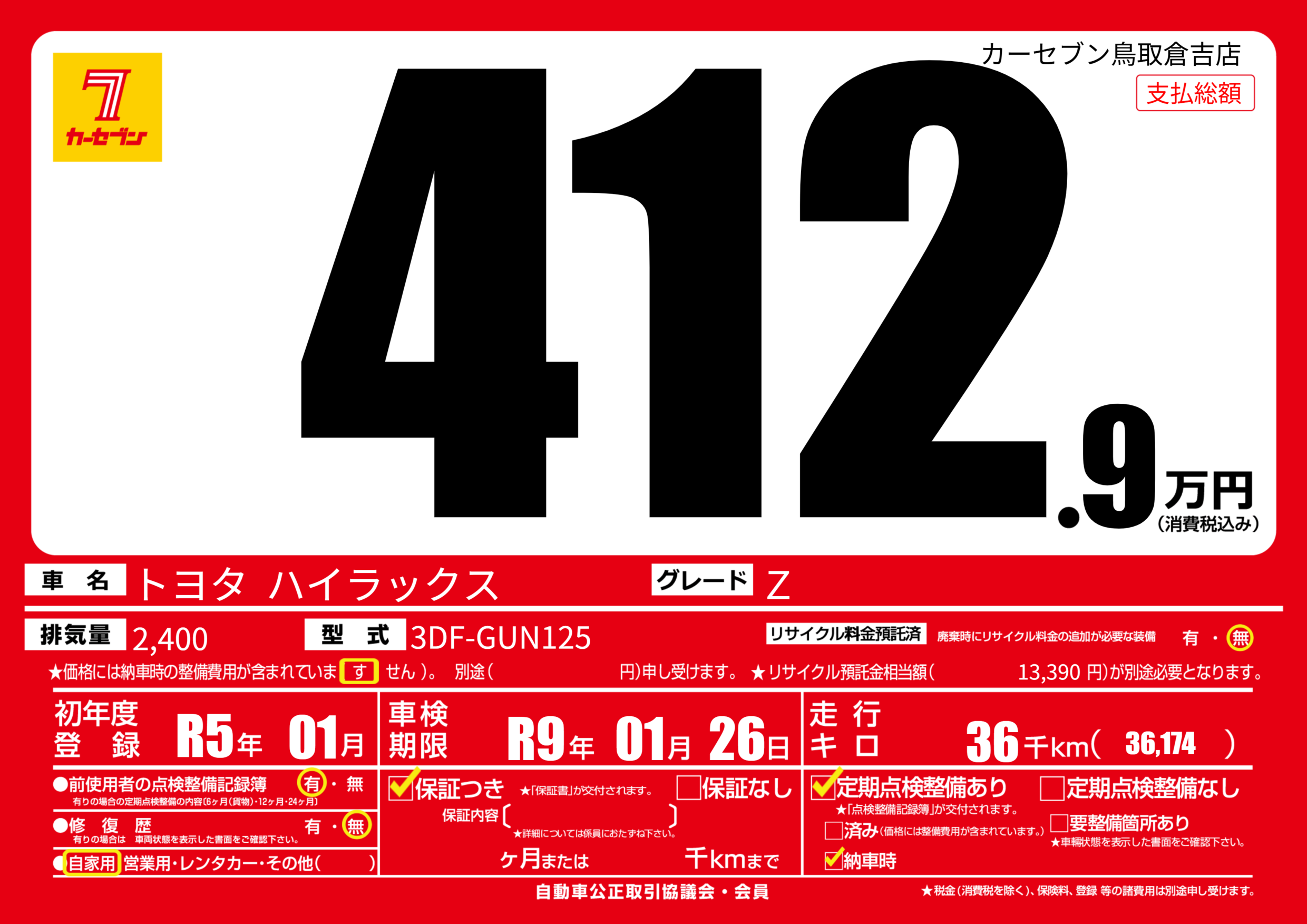 | 走行キロ | 3.6万km | 初年度登録 | R5年01月 |