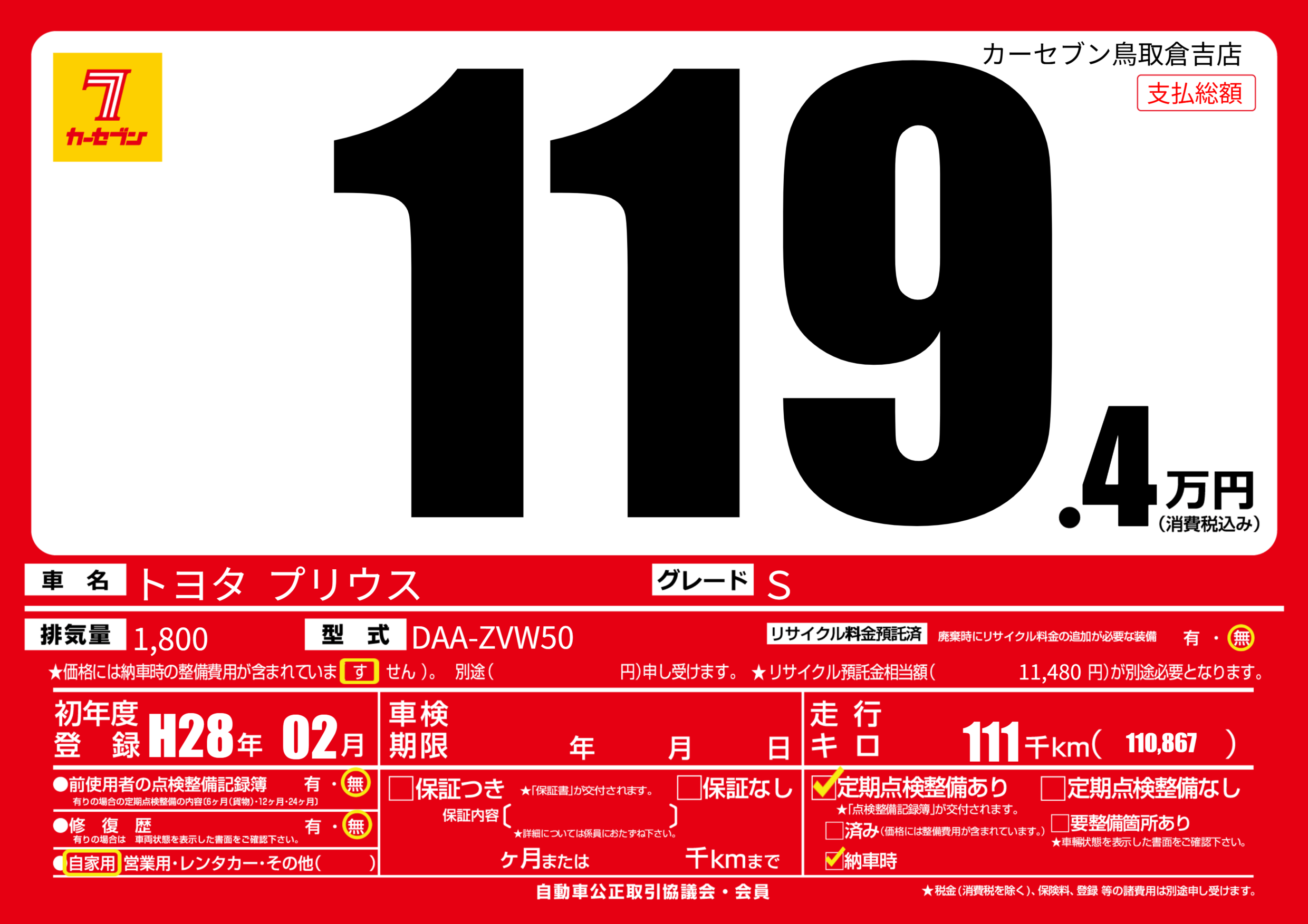 | 車名 | トヨタ プリウス | グレード ミッション 排気量 |
