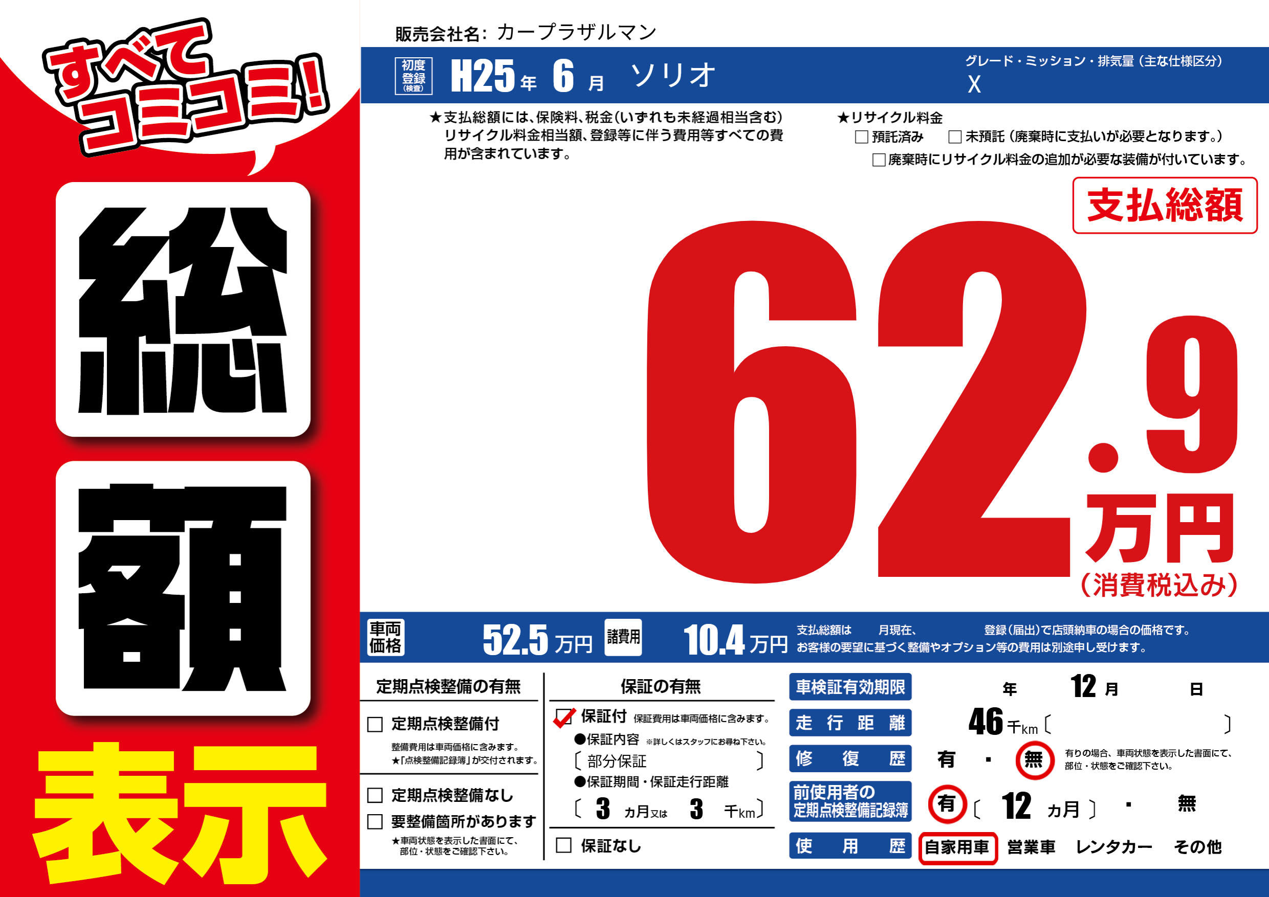 | 車名 | ソリオ | グレード ミッション 排気量 |