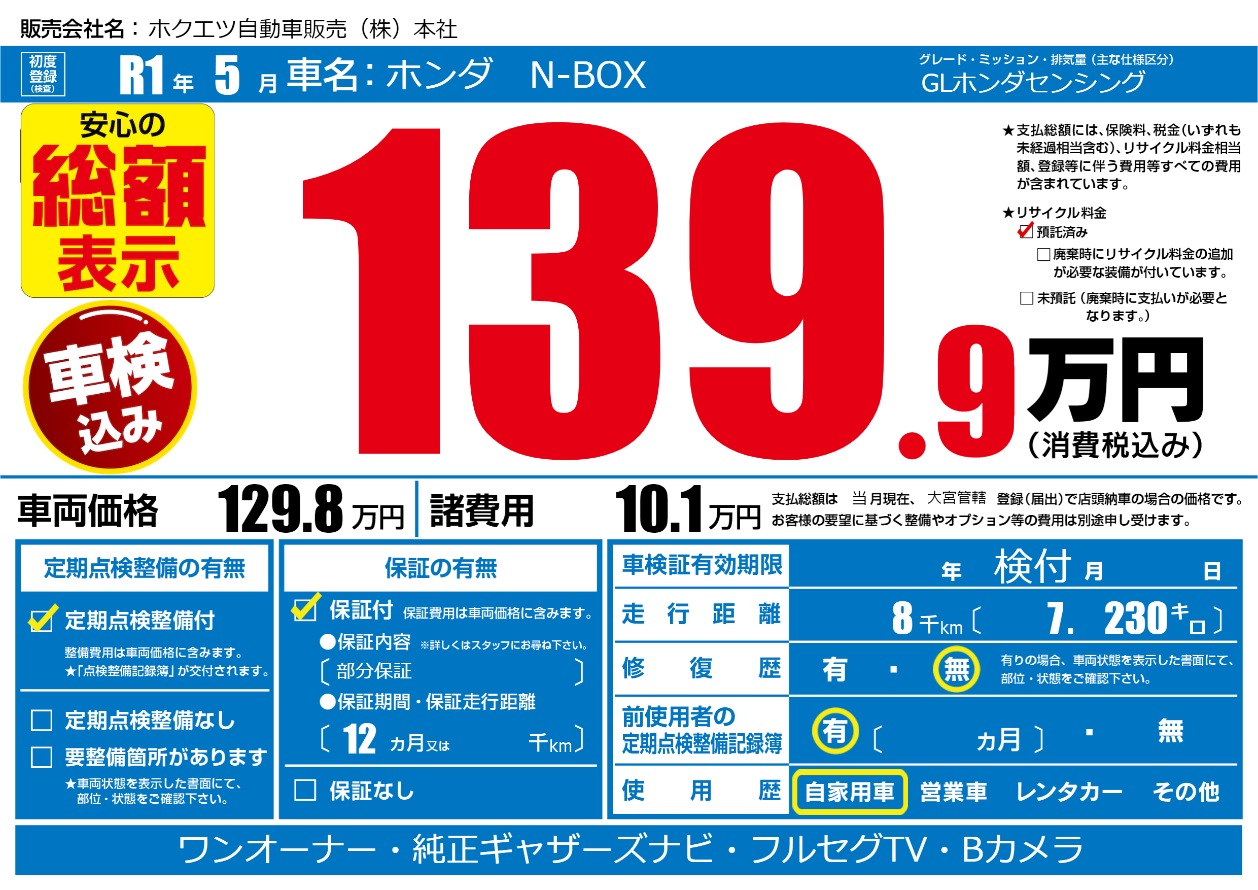 | 走行キロ | 0.8万km | 初年度登録 | R1年5月 |