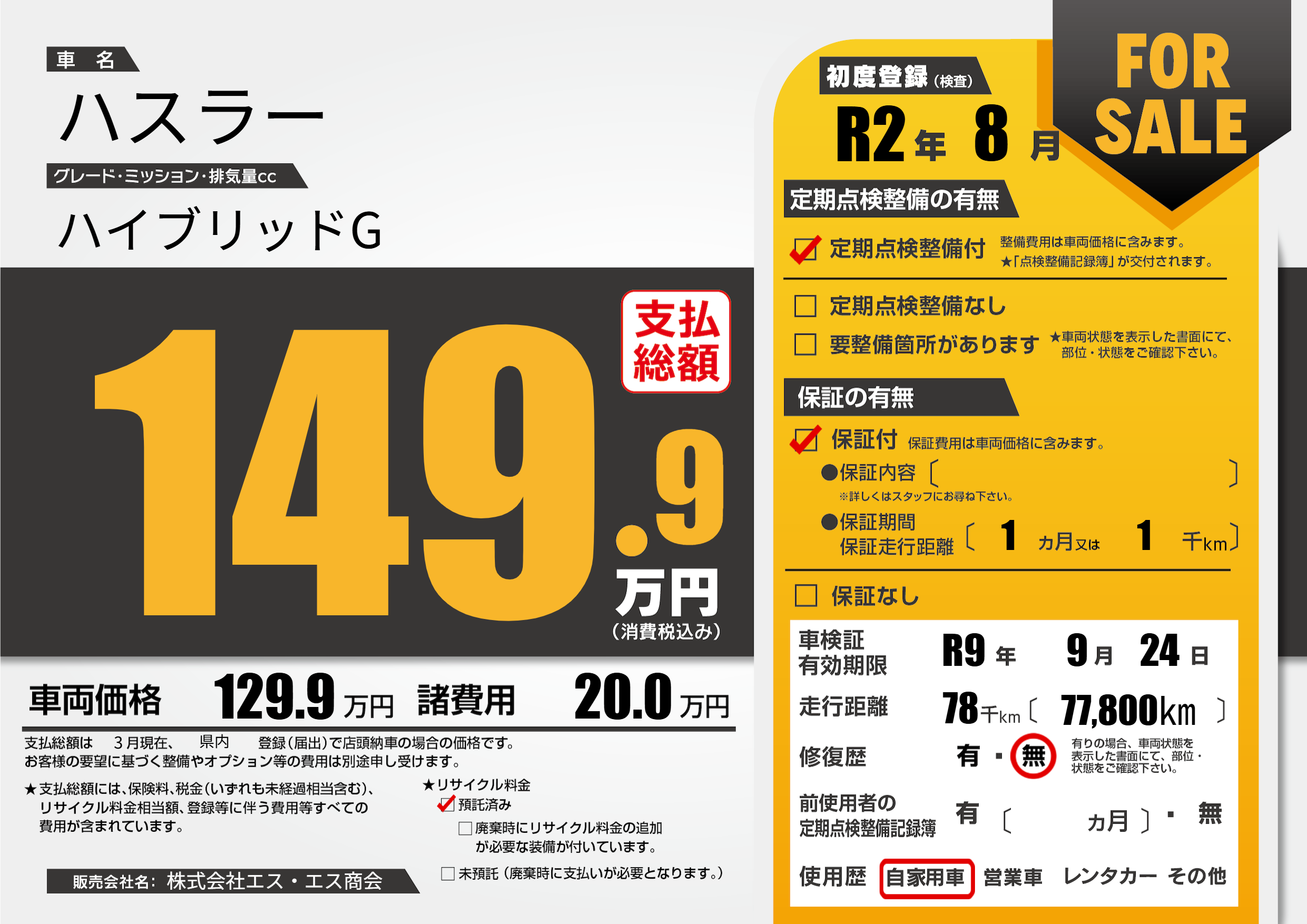 | 走行キロ | 7.8万km | 初年度登録 | R2年8月 |